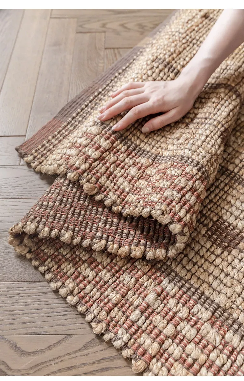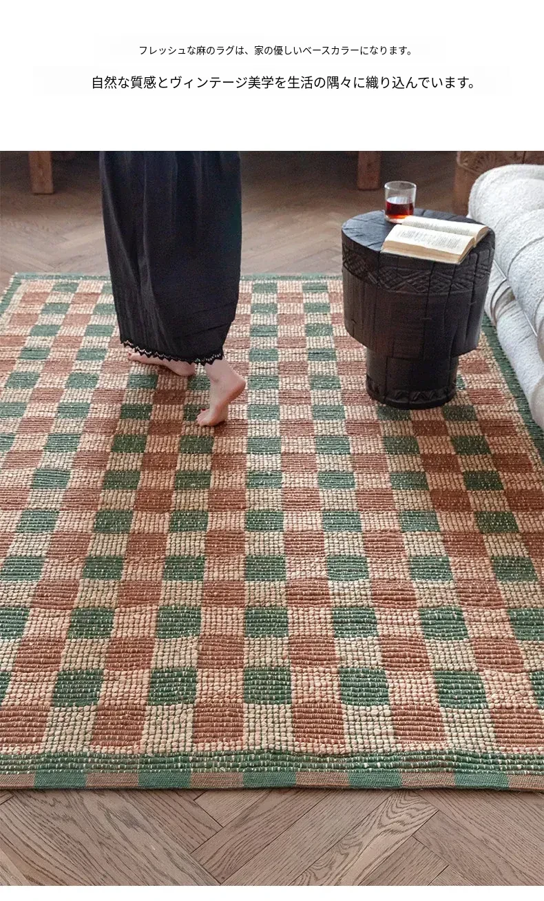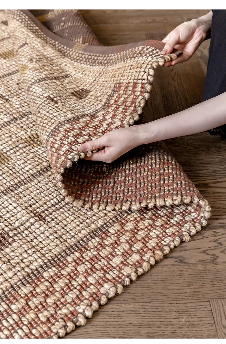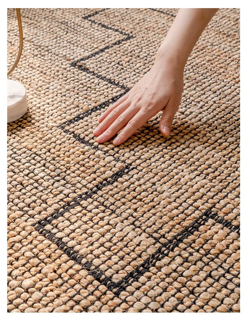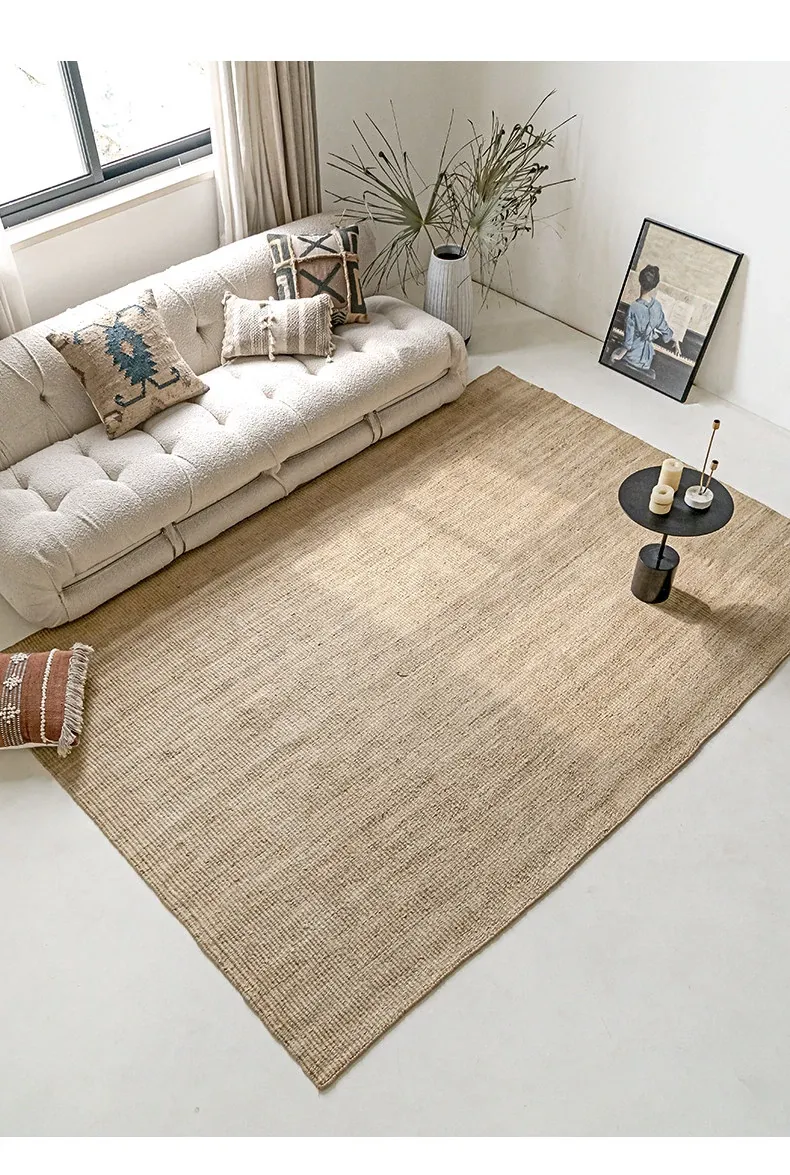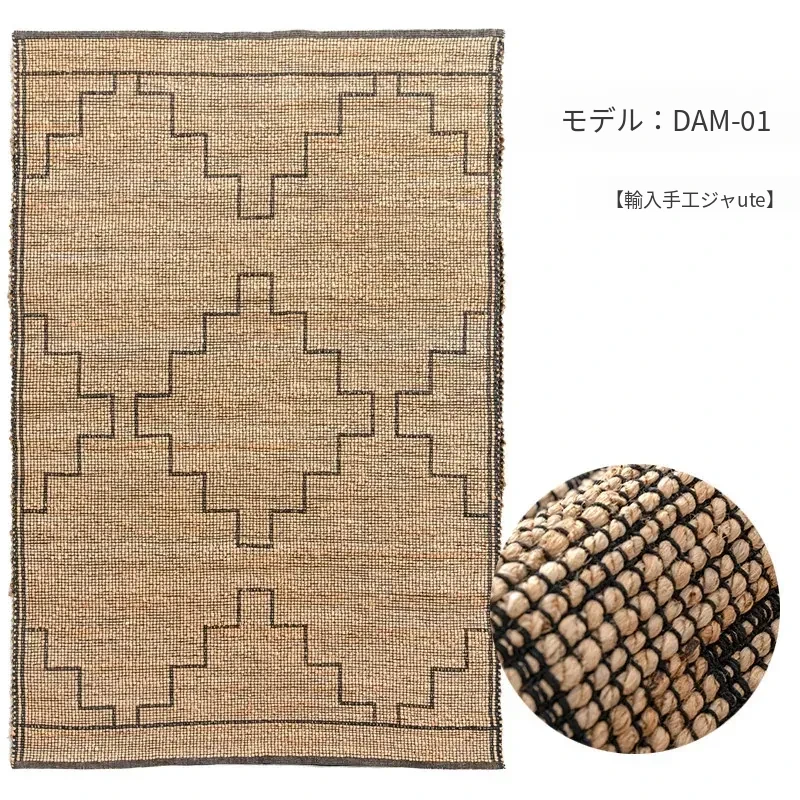 視覚と味覚のハーモニーを楽しむ!無接着剤の輸入ジュートカーペット、手編みの和風デザインで、リビングのテーブルを引き立てるイタリアンエレガンス。天然素材の温もりを感じて、上質な空間を演出します。