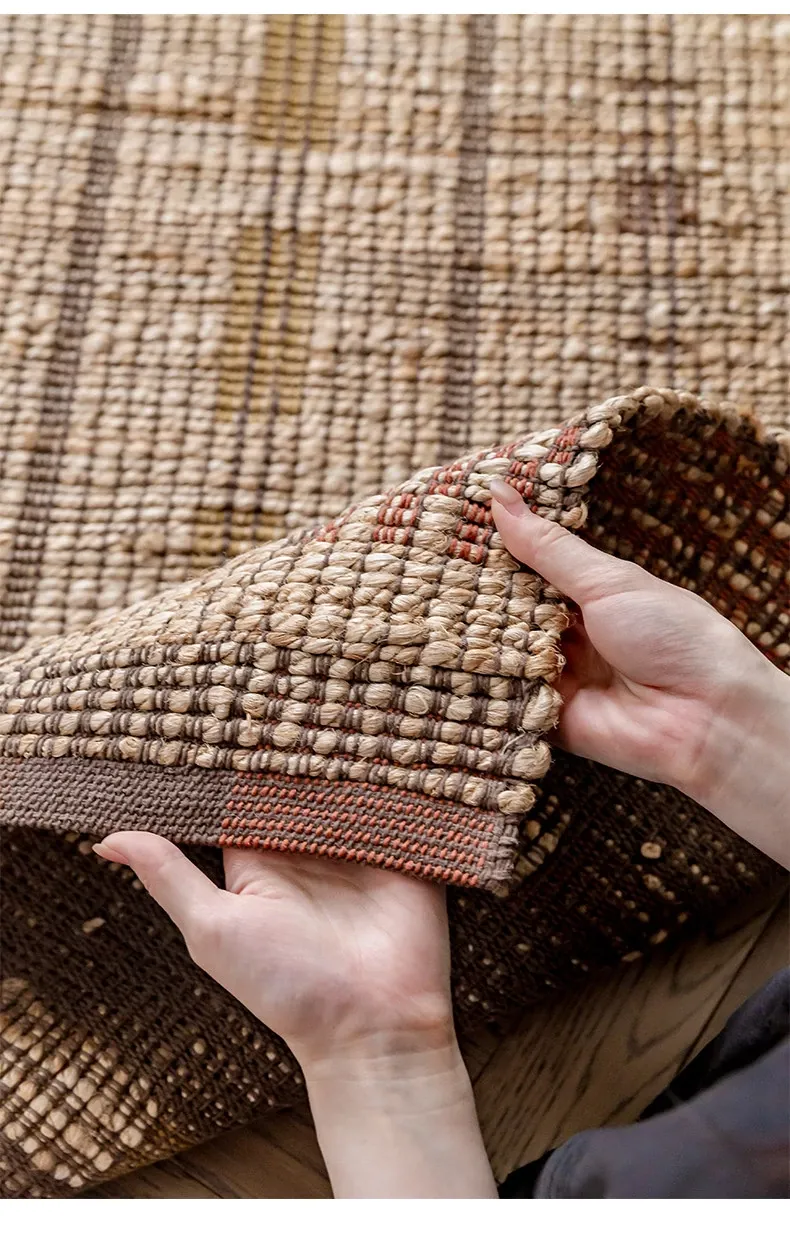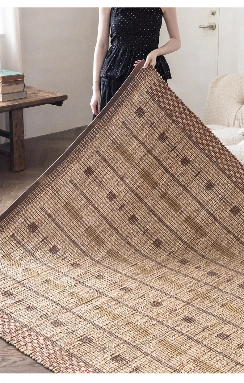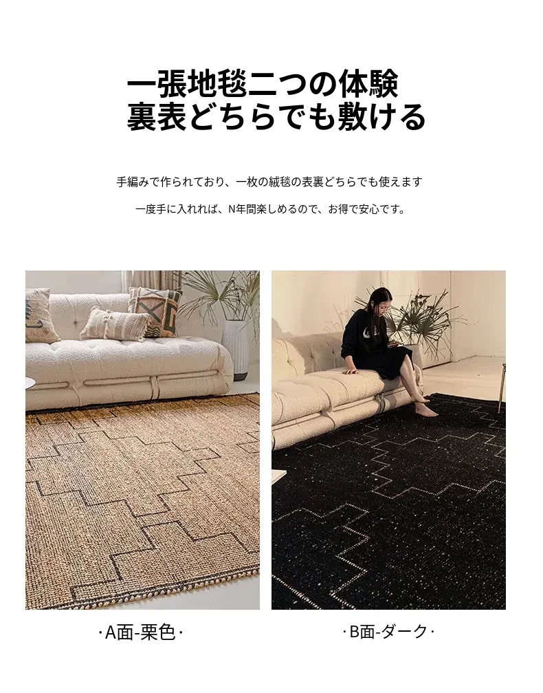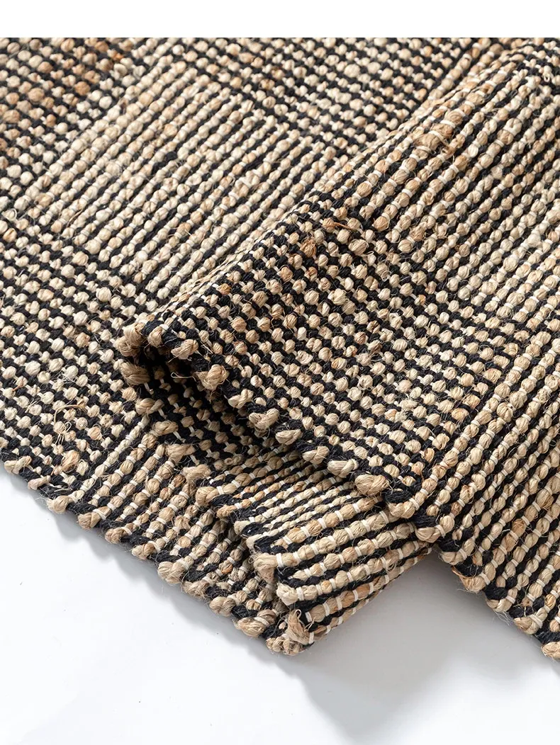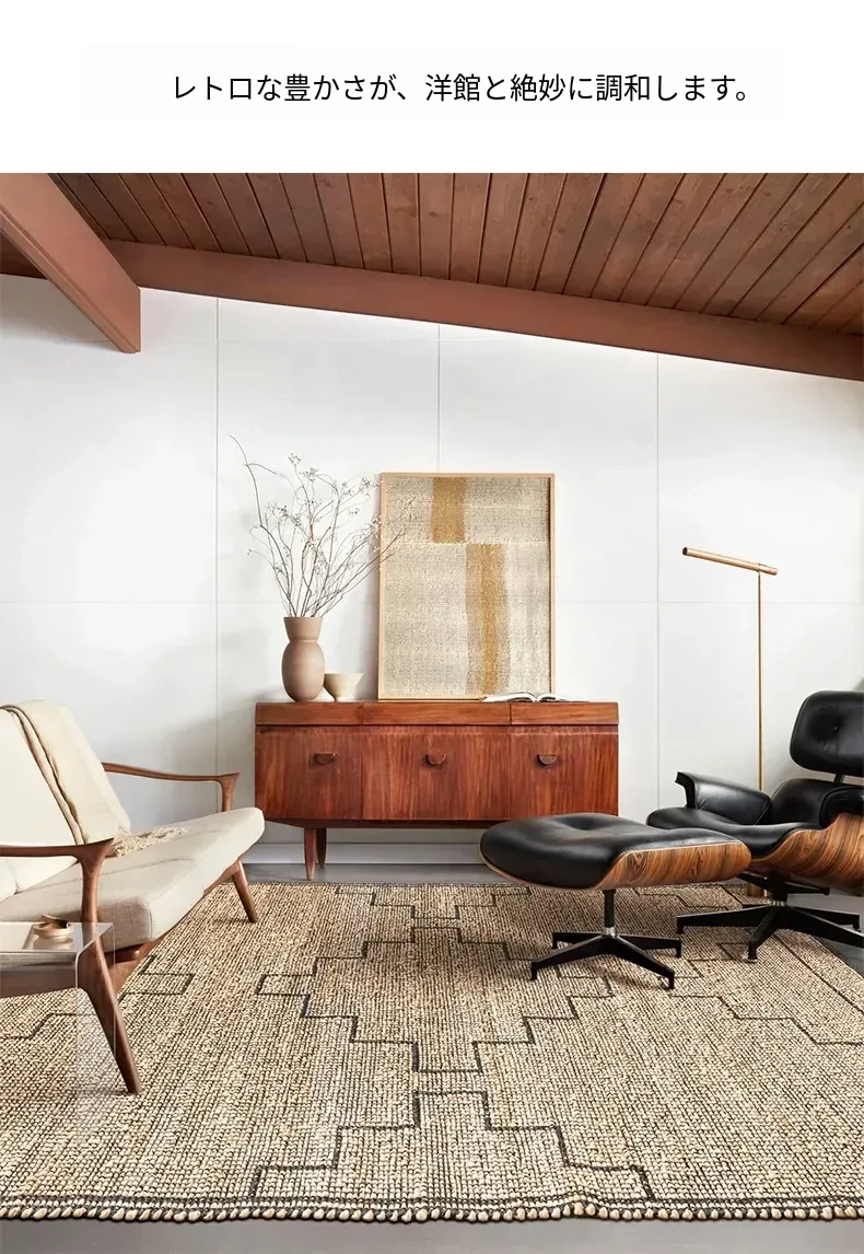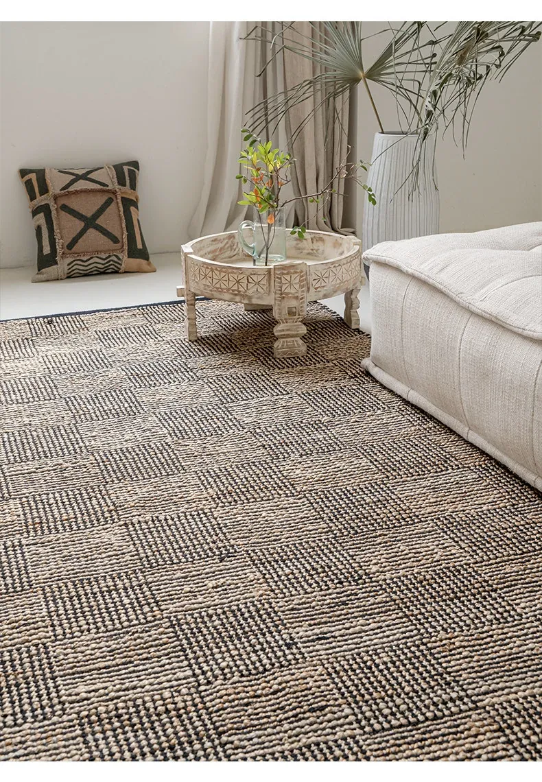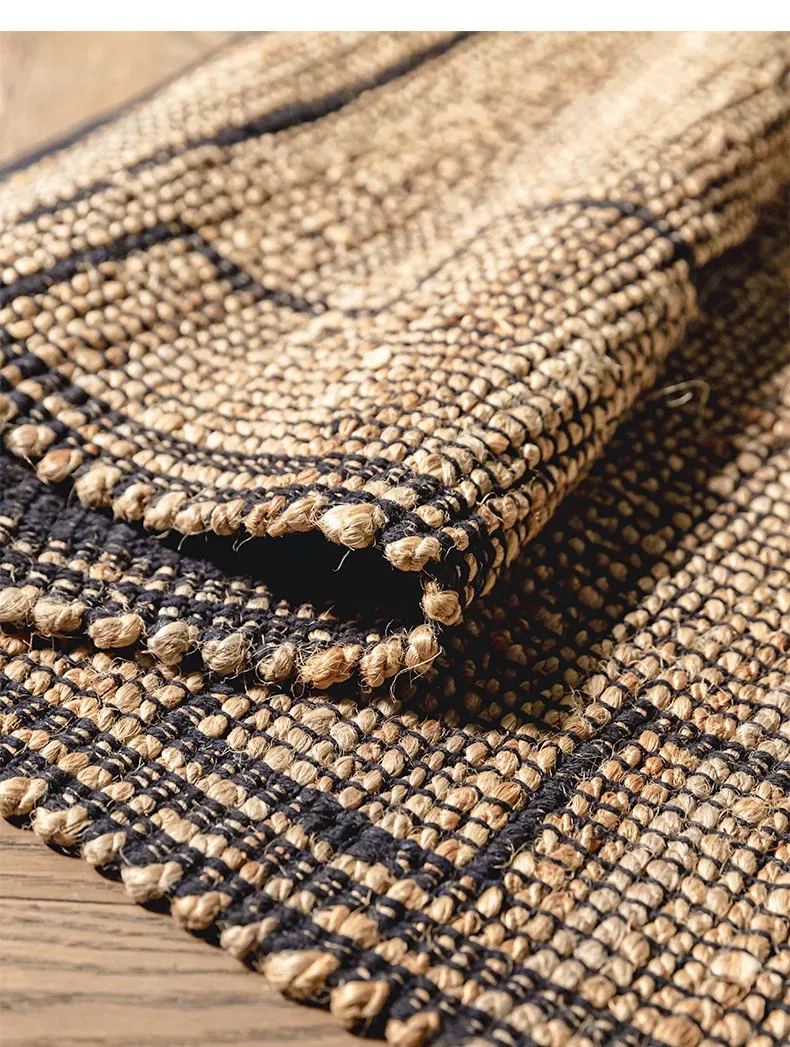 視覚と味覚のハーモニーを楽しむ!無接着剤の輸入ジュートカーペット、手編みの和風デザインで、リビングのテーブルを引き立てるイタリアンエレガンス。天然素材の温もりを感じて、上質な空間を演出します。
