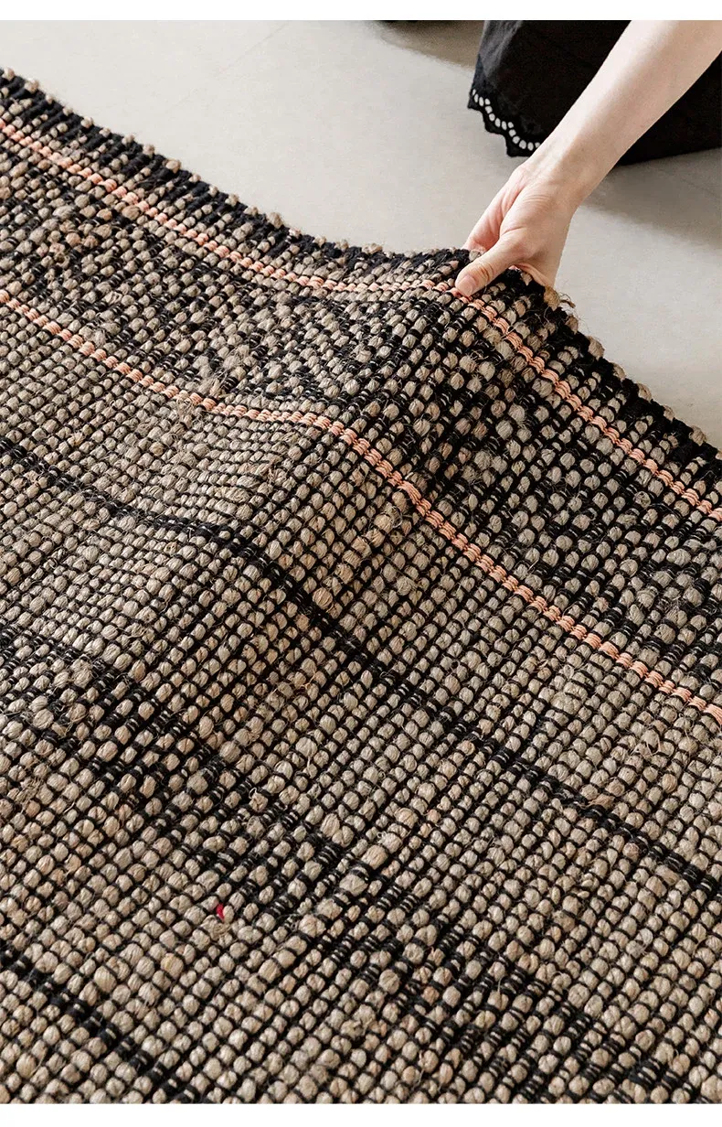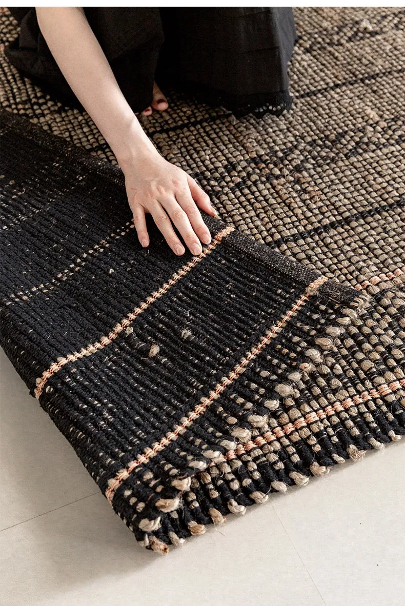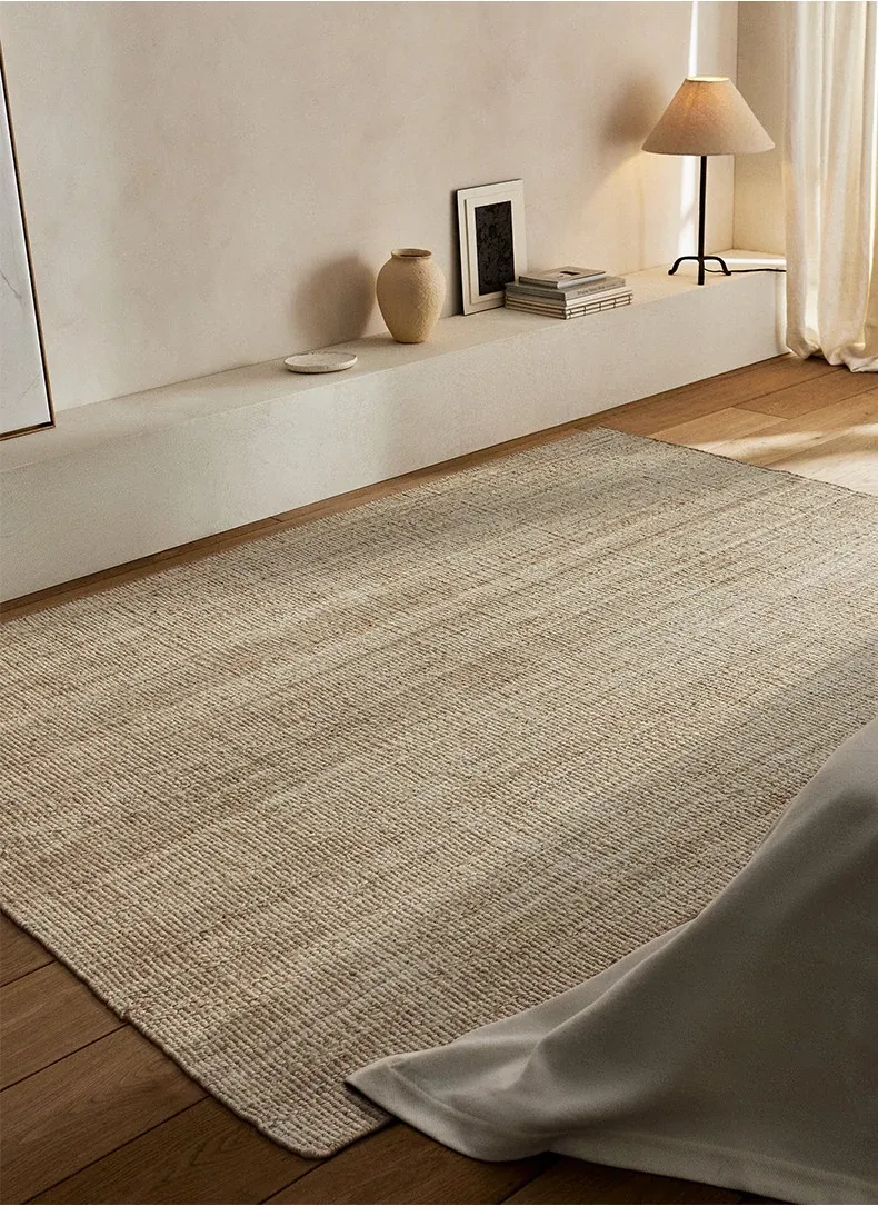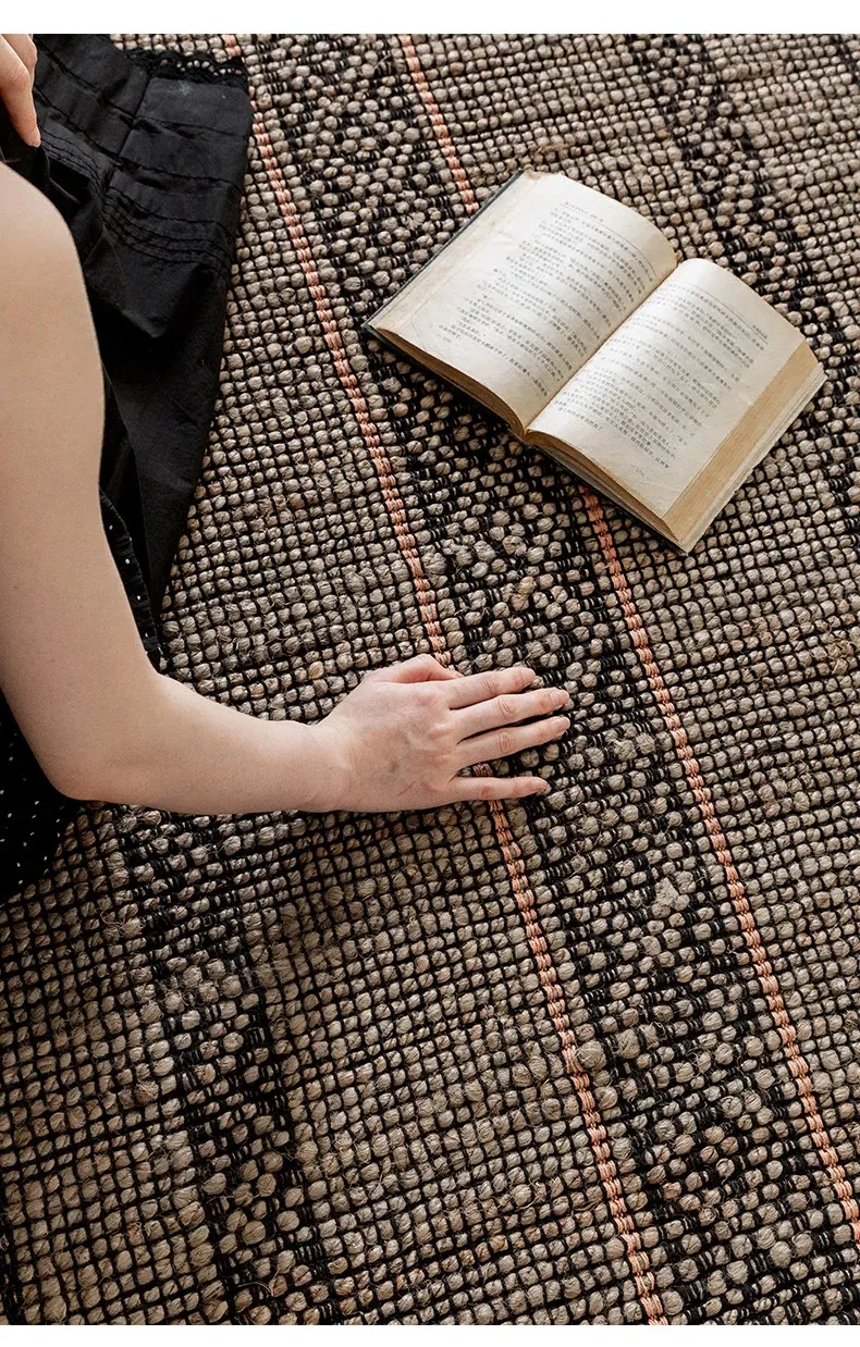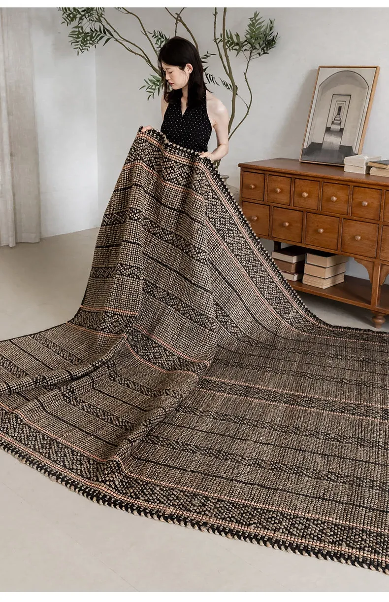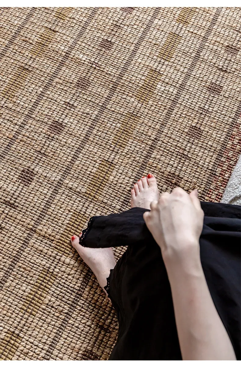 視覚と味覚のハーモニーを楽しむ!無接着剤の輸入ジュートカーペット、手編みの和風デザインで、リビングのテーブルを引き立てるイタリアンエレガンス。天然素材の温もりを感じて、上質な空間を演出します。