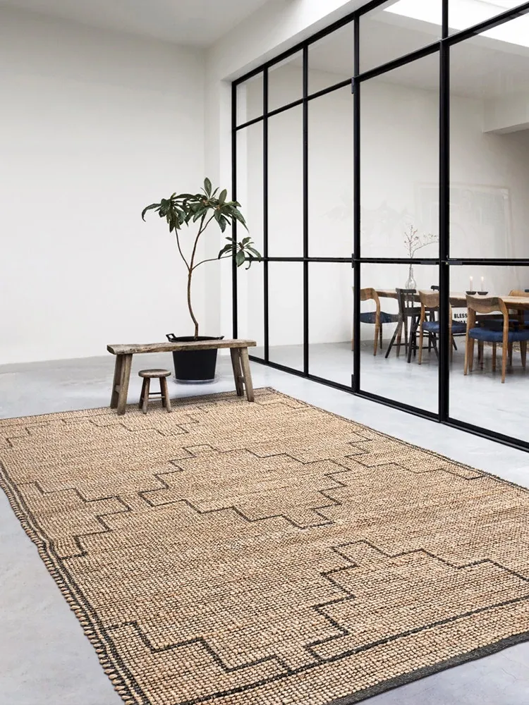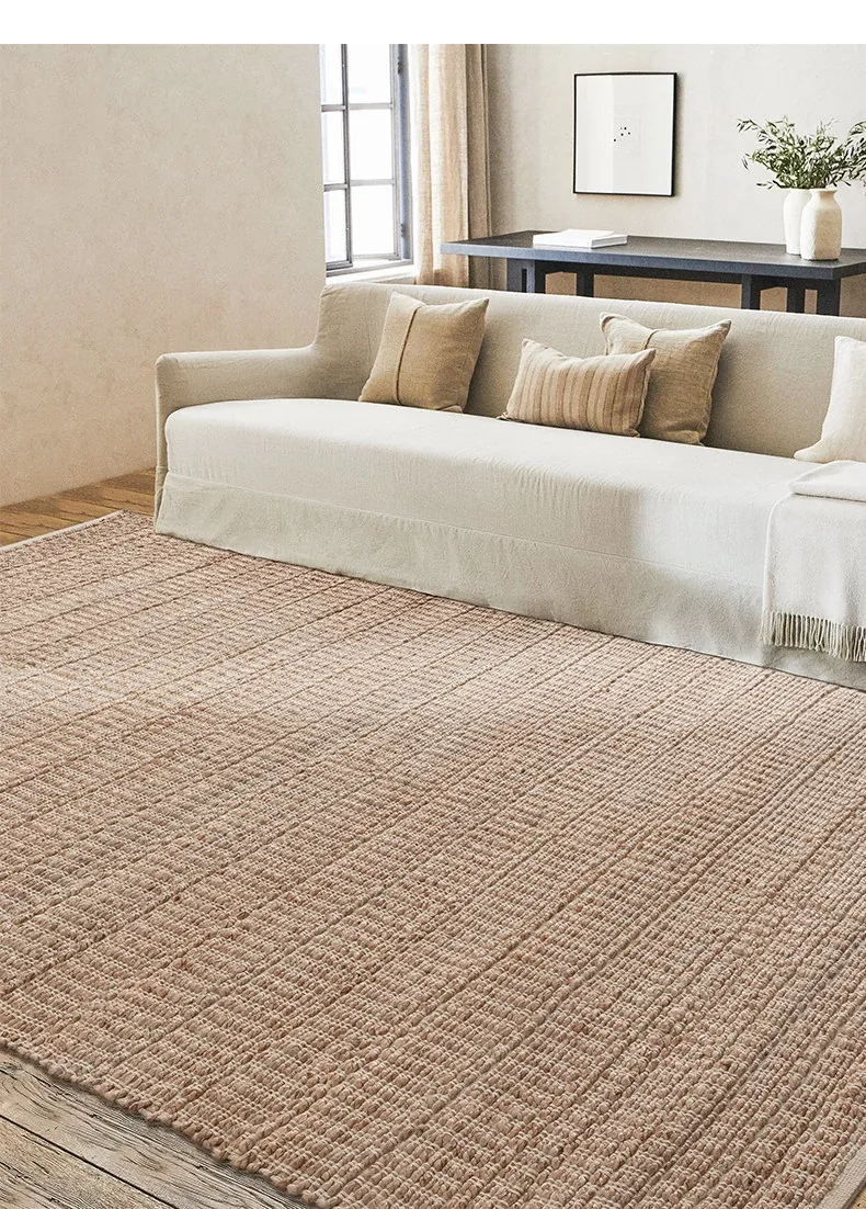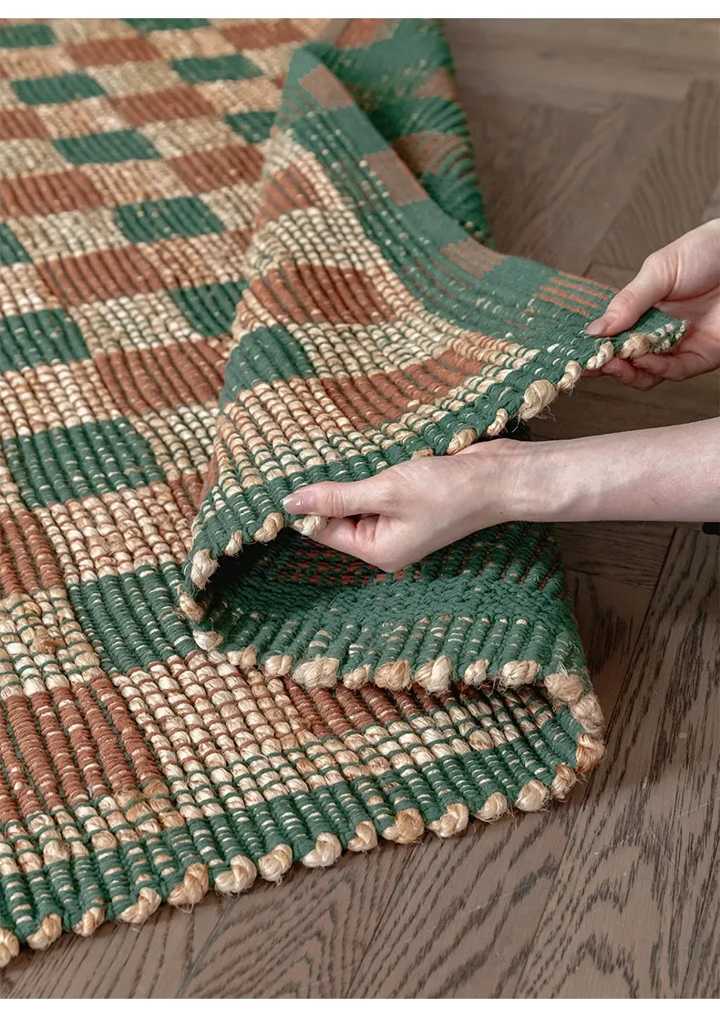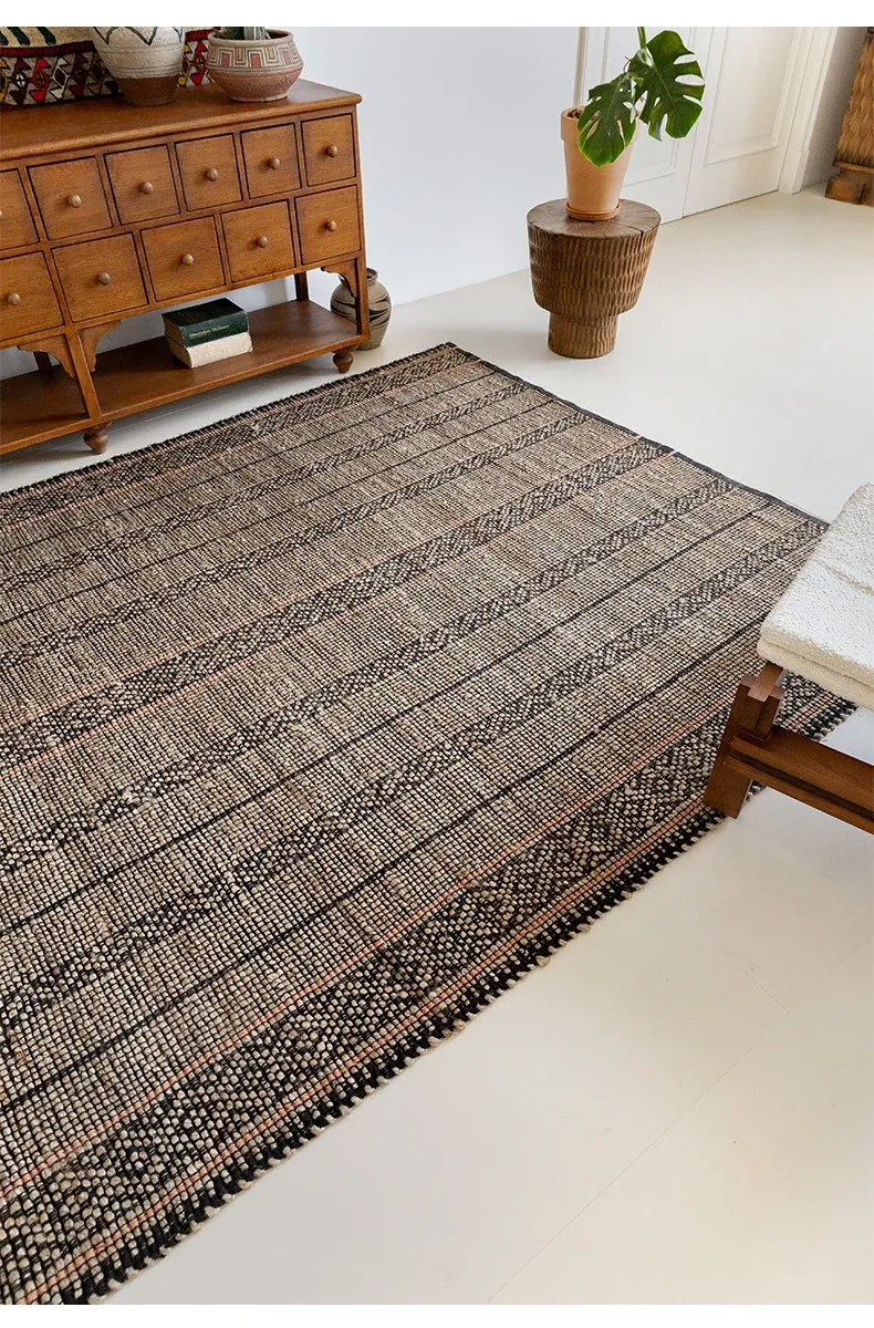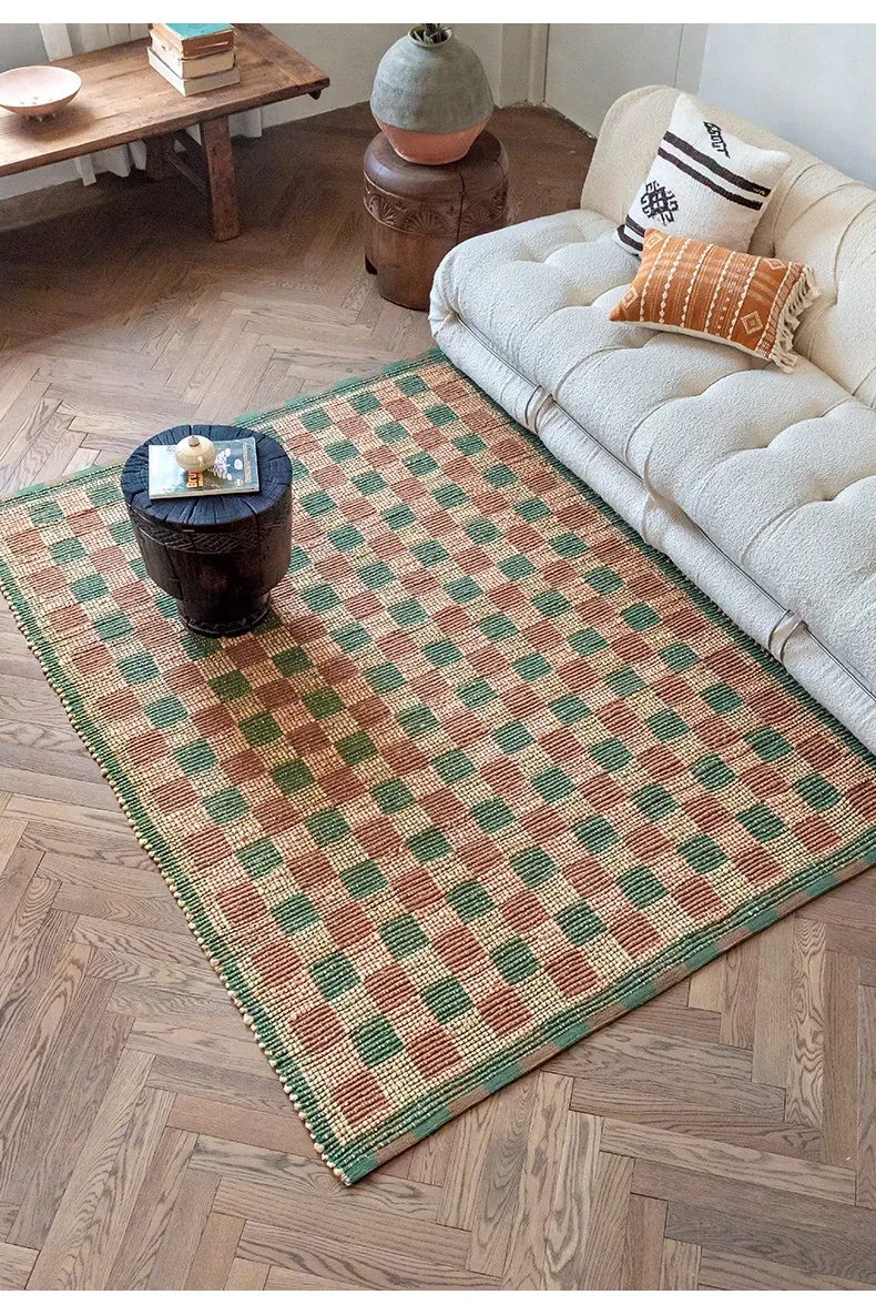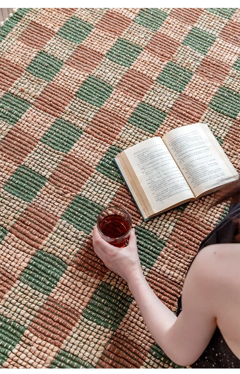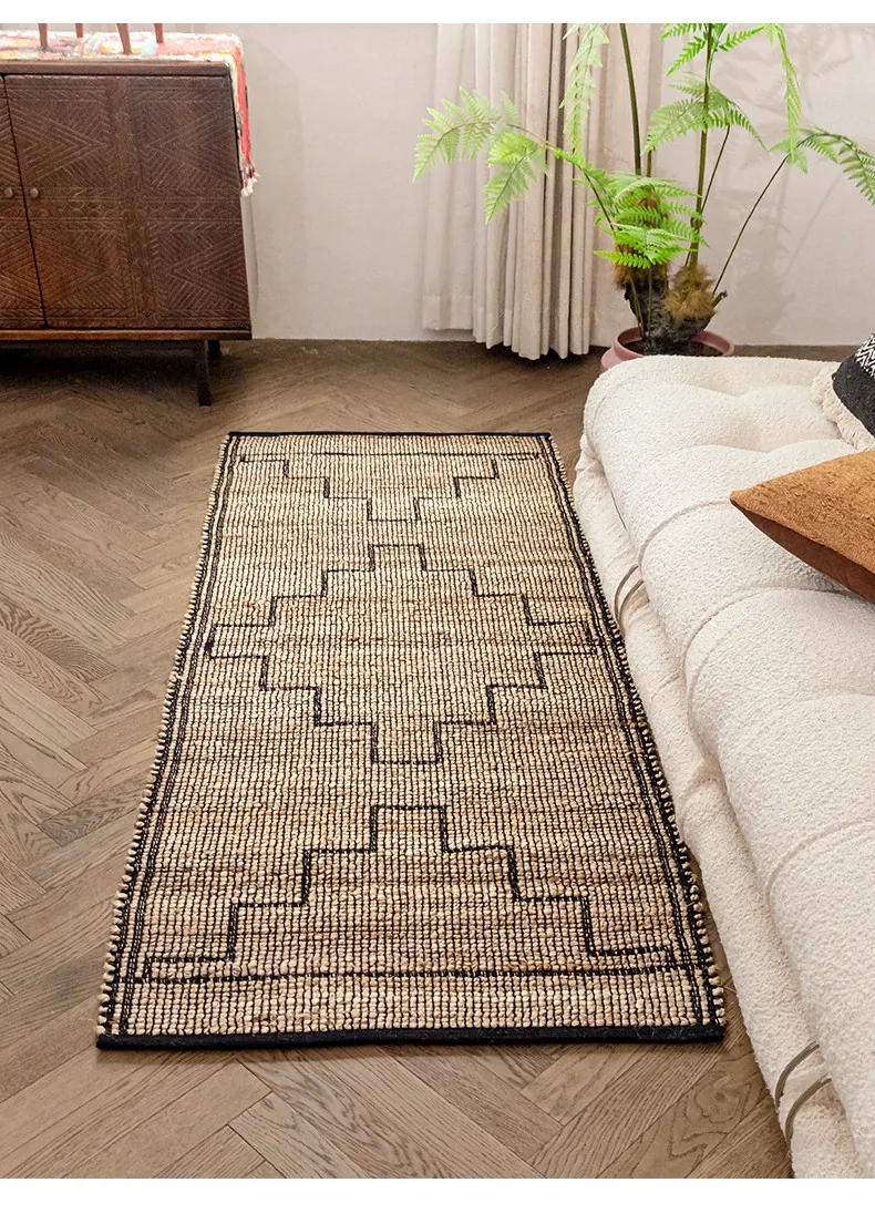 視覚と味覚のハーモニーを楽しむ!無接着剤の輸入ジュートカーペット、手編みの和風デザインで、リビングのテーブルを引き立てるイタリアンエレガンス。天然素材の温もりを感じて、上質な空間を演出します。