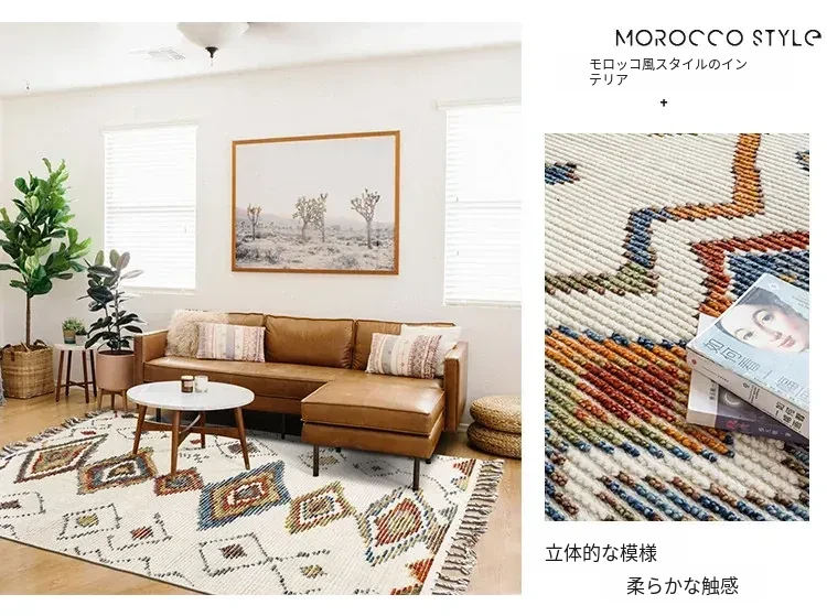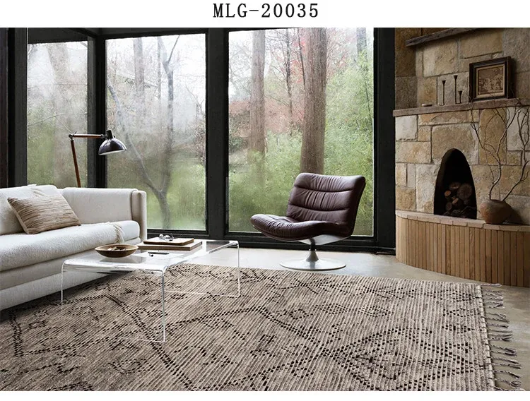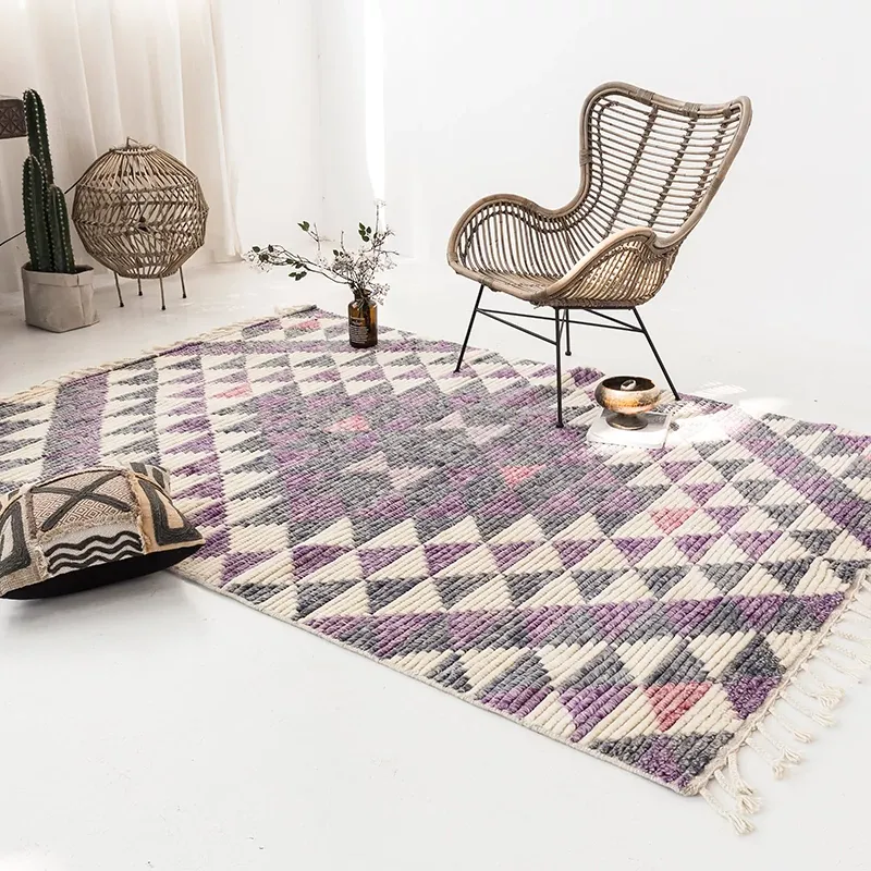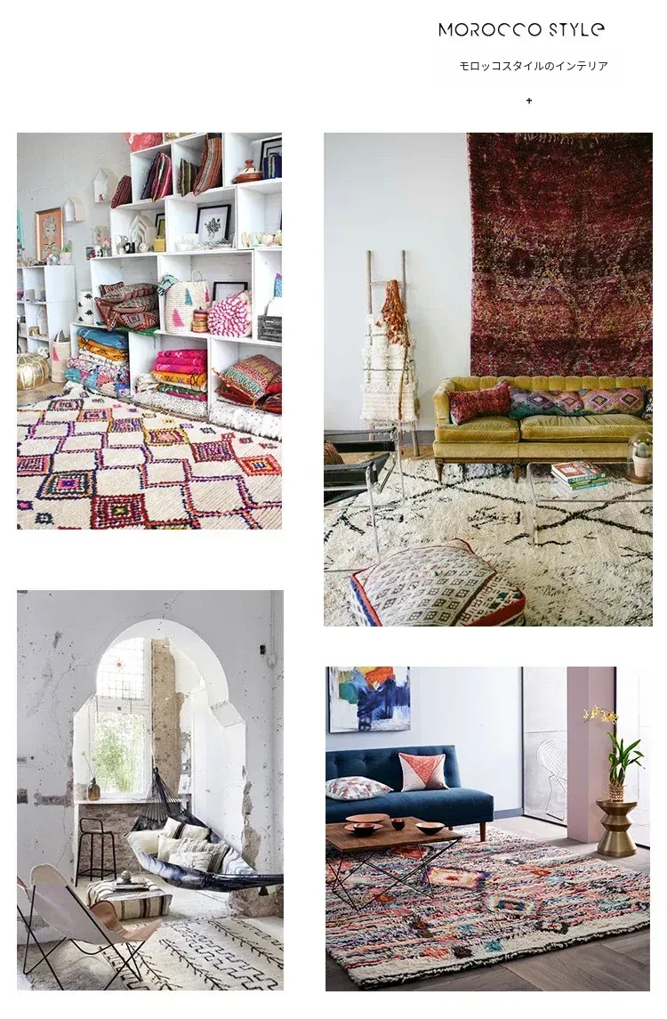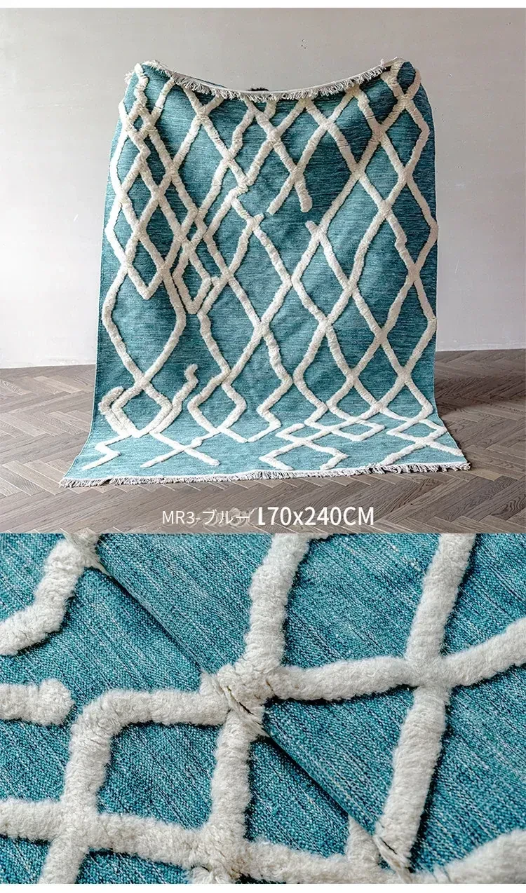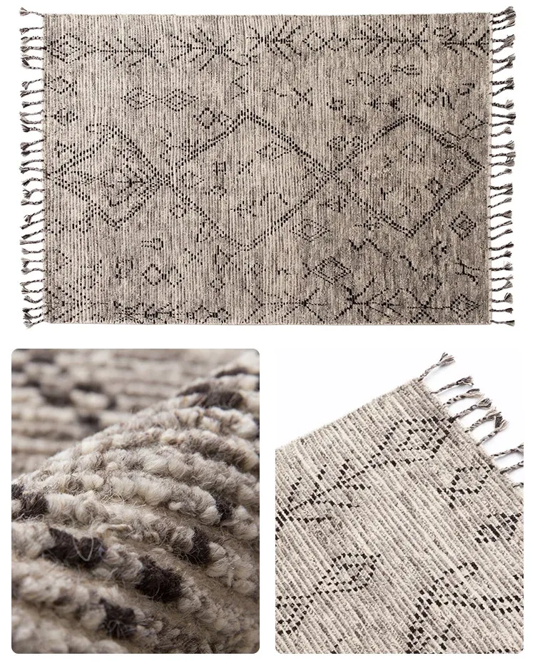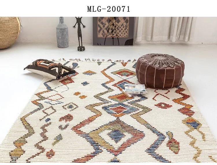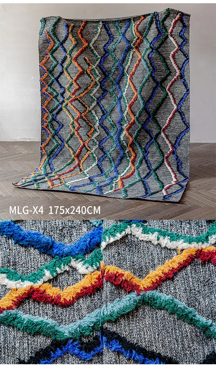 ビジュアルな味わいを持つ北欧輸入の現代的でシンプルな中式リビング用モロッコミックススタイルの手作りウールラグ。心地よい温もりと洗練されたデザインで、あなたの空間を特別に演出します!