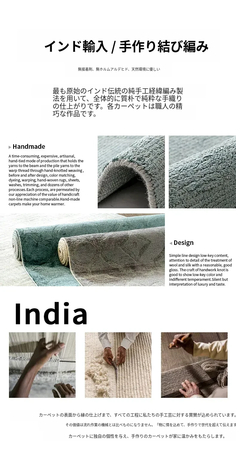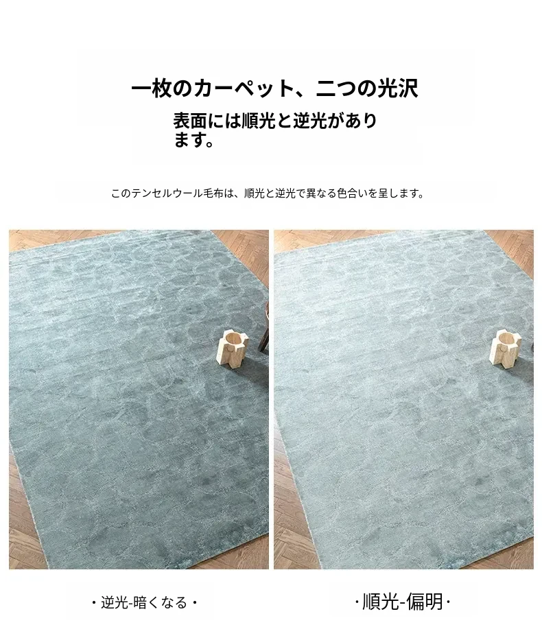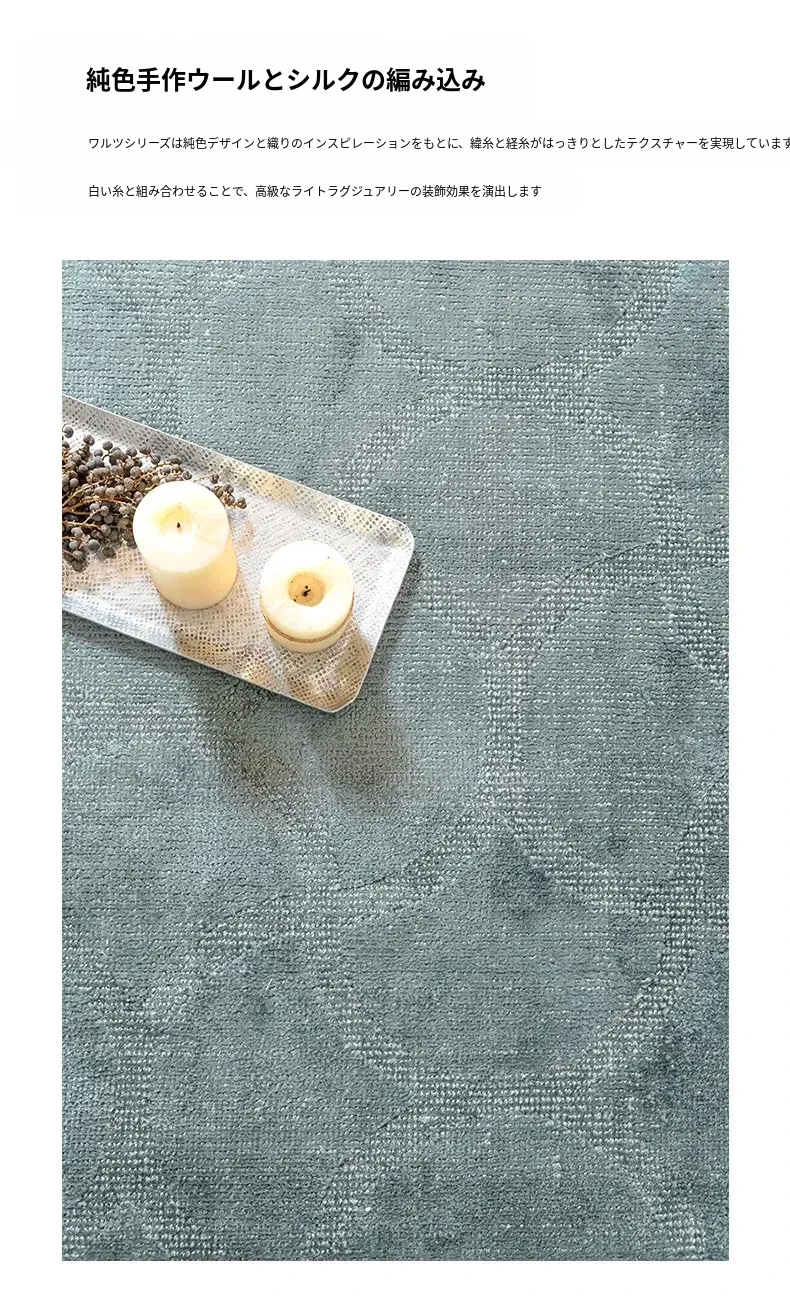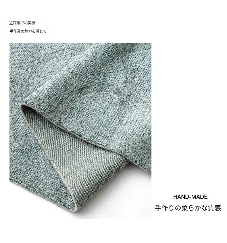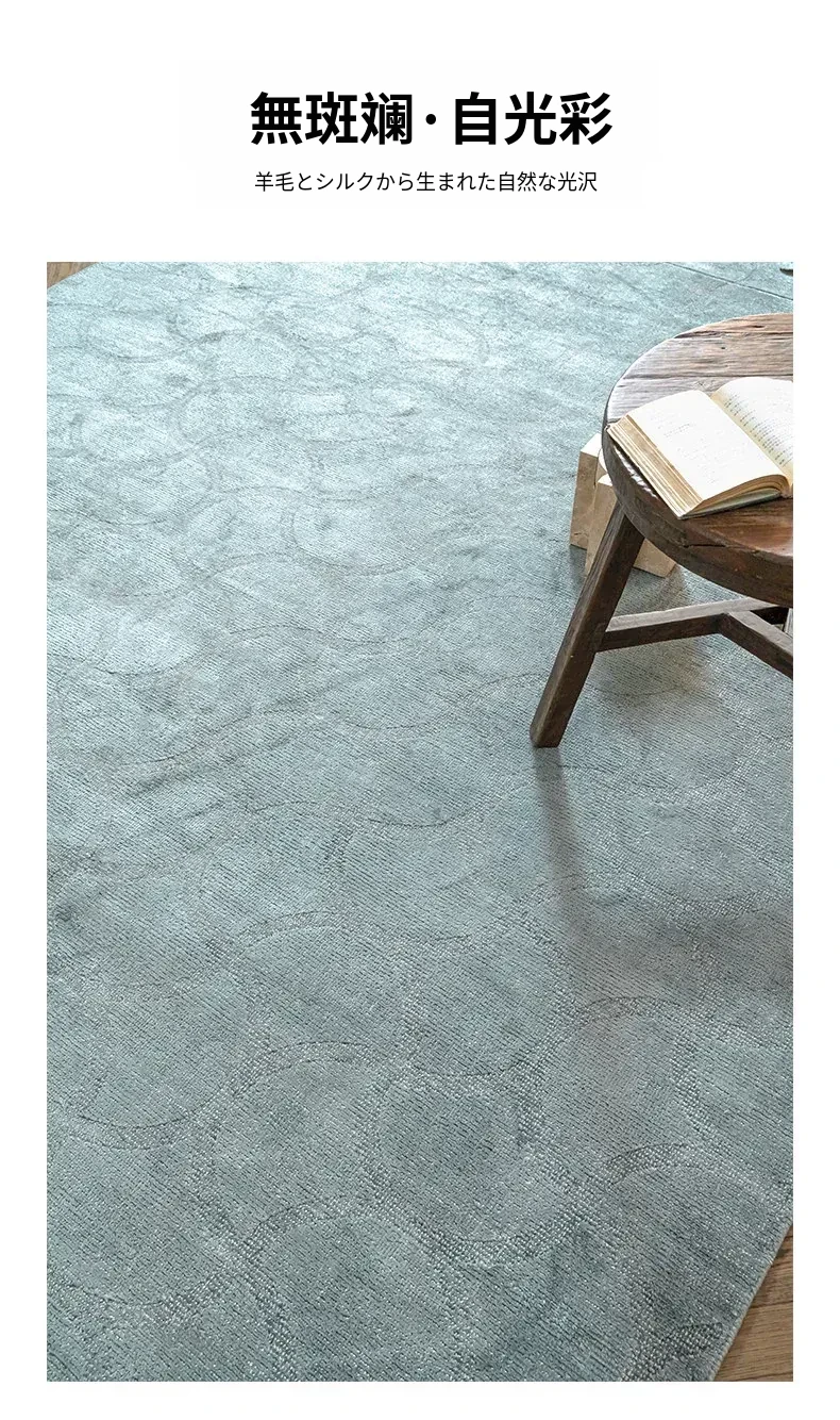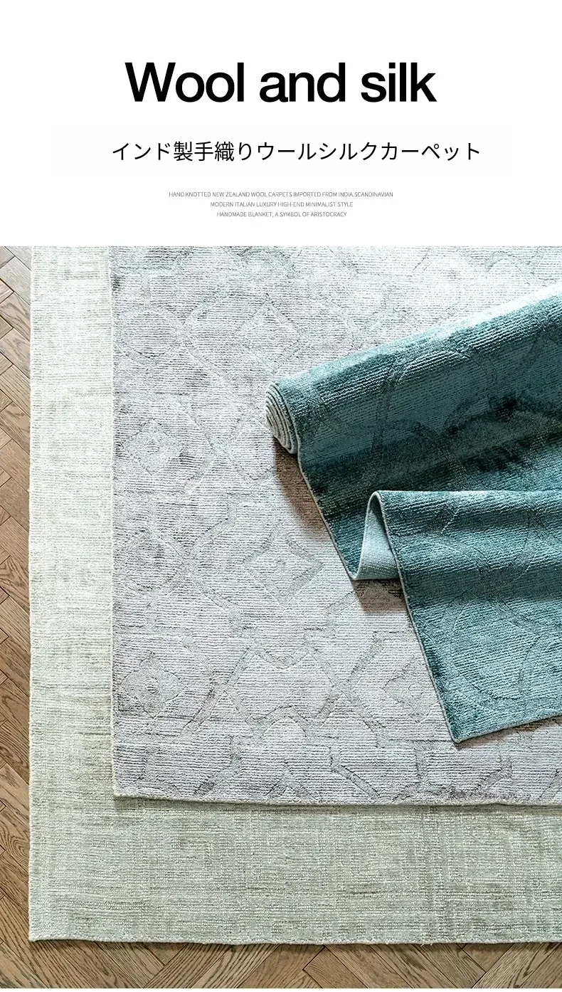 視覚と味覚のハーモニー!オリジナル輸入の高級感あふれる大地毯。リビングにぴったりのウールとシルク混合のグリーンカーペット、接着剤やホルムアルデヒド不使用で安心・安全。