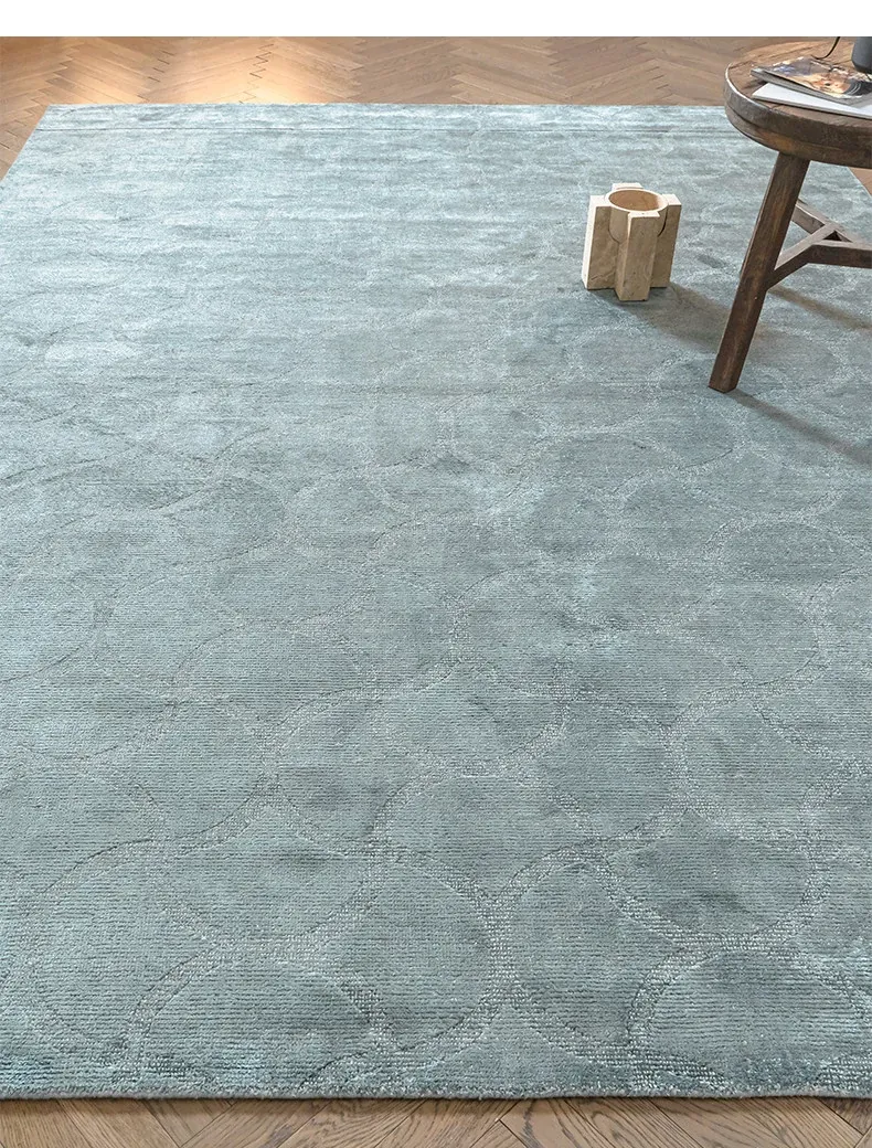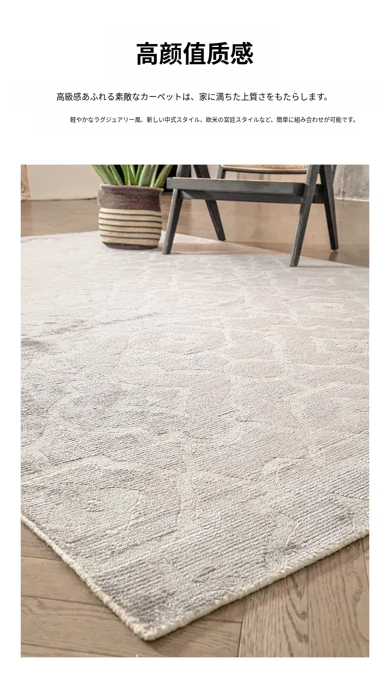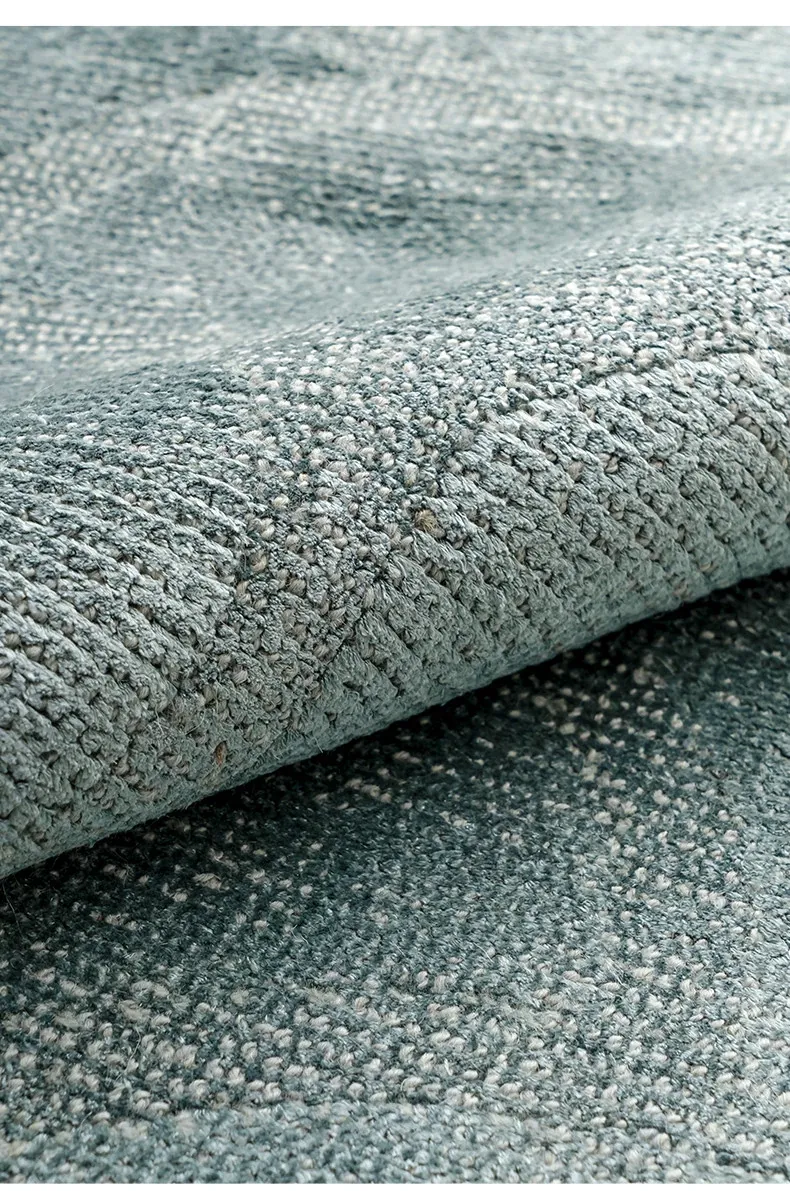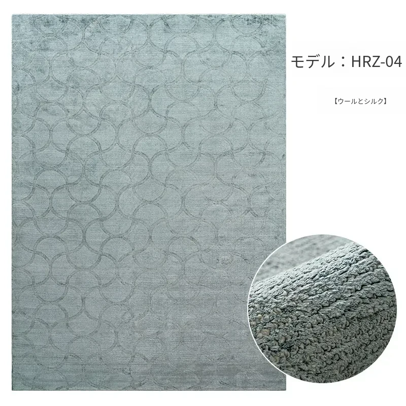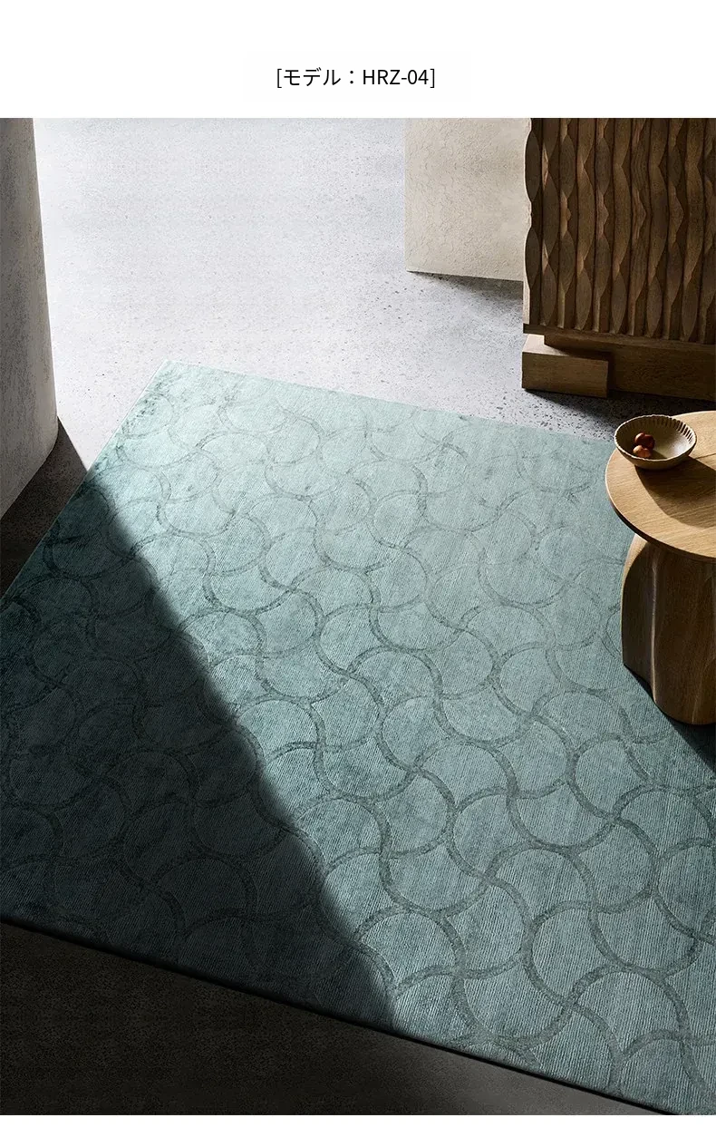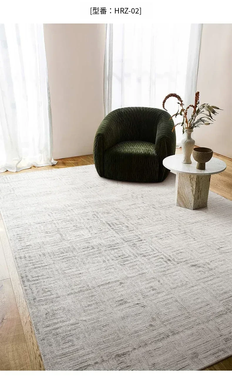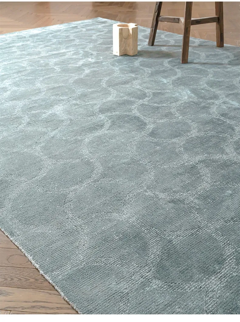 視覚と味覚のハーモニー!オリジナル輸入の高級感あふれる大地毯。リビングにぴったりのウールとシルク混合のグリーンカーペット、接着剤やホルムアルデヒド不使用で安心・安全。