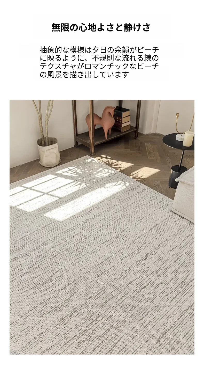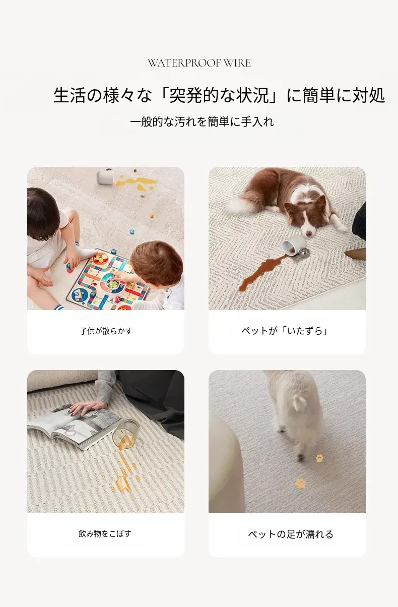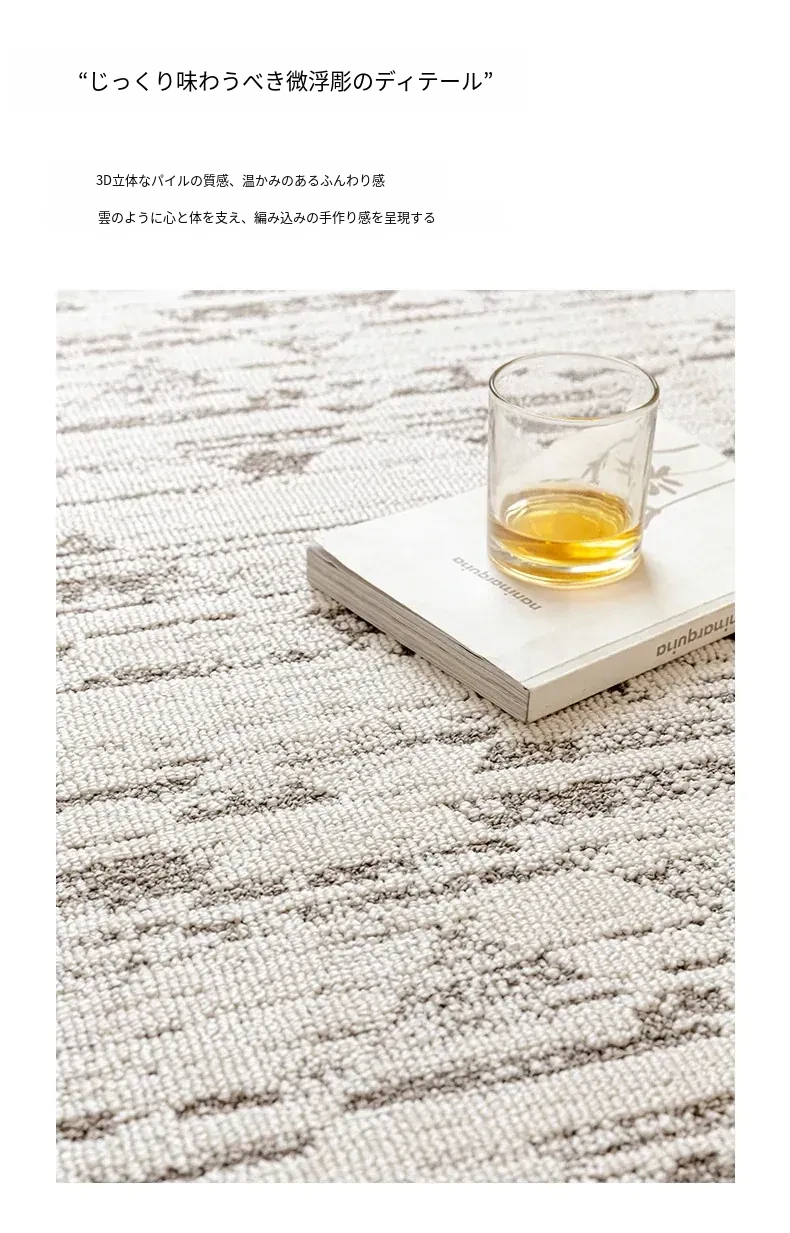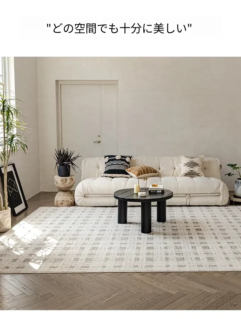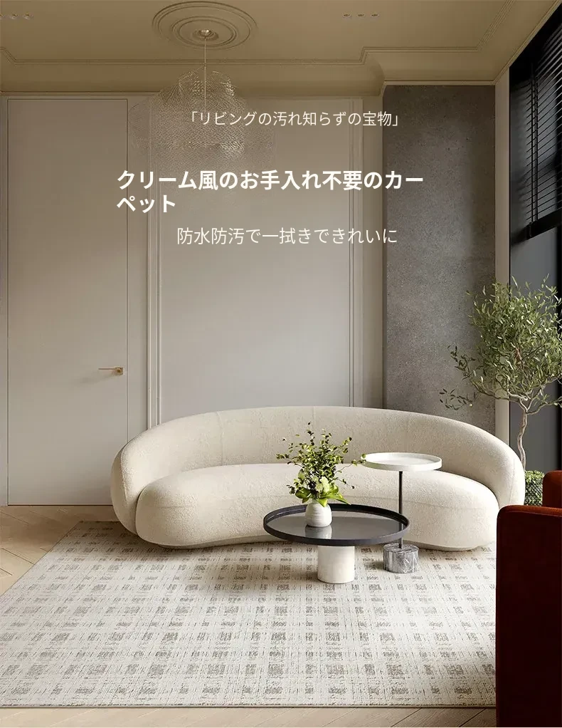 視覚と味覚を楽しむ防水・防汚のリビングラグ!手間いらずでお手入れ簡単、クリーミーな風合いで軽やかさと高級感を演出。侘寂の美しさを引き立てる、あなたの空間にぴったりのアイテムです。