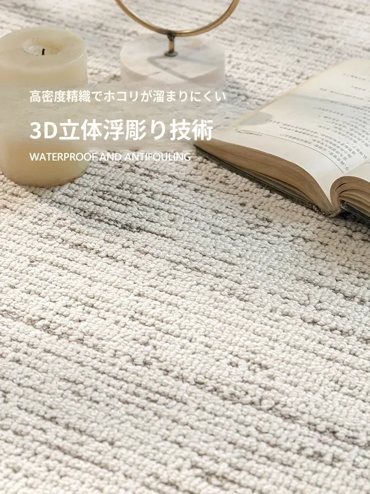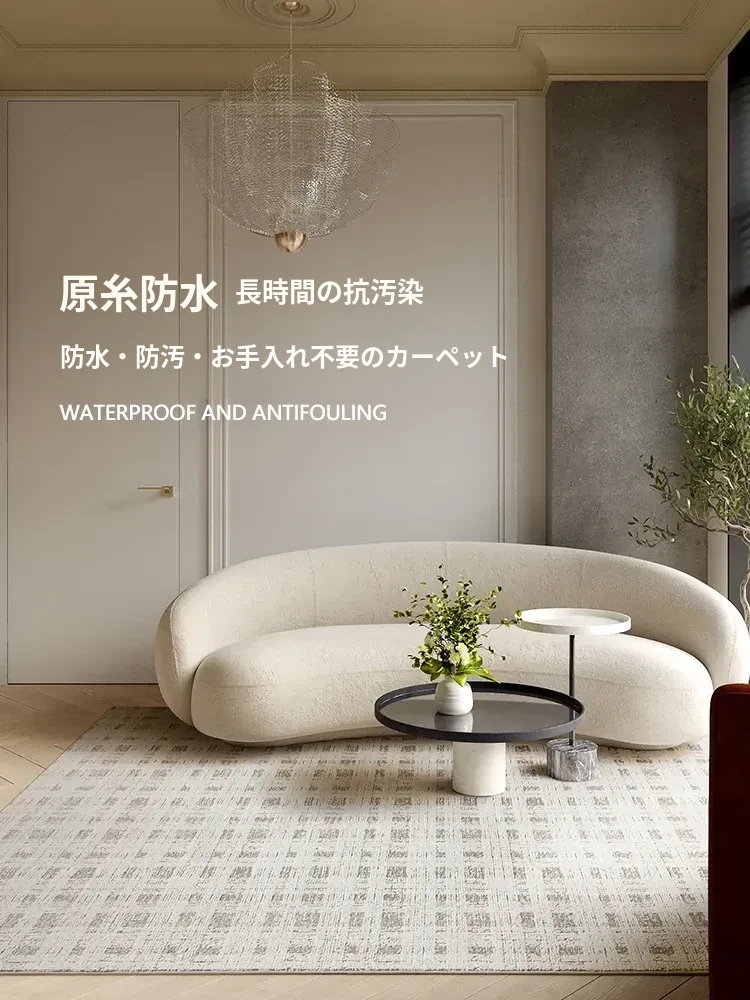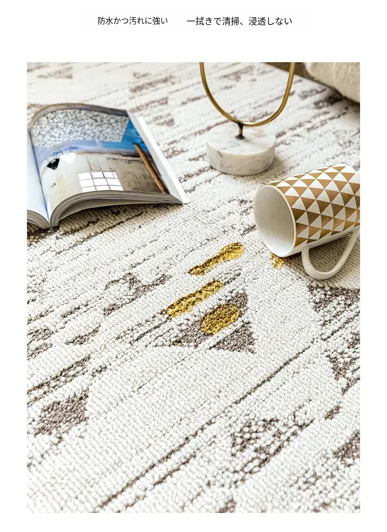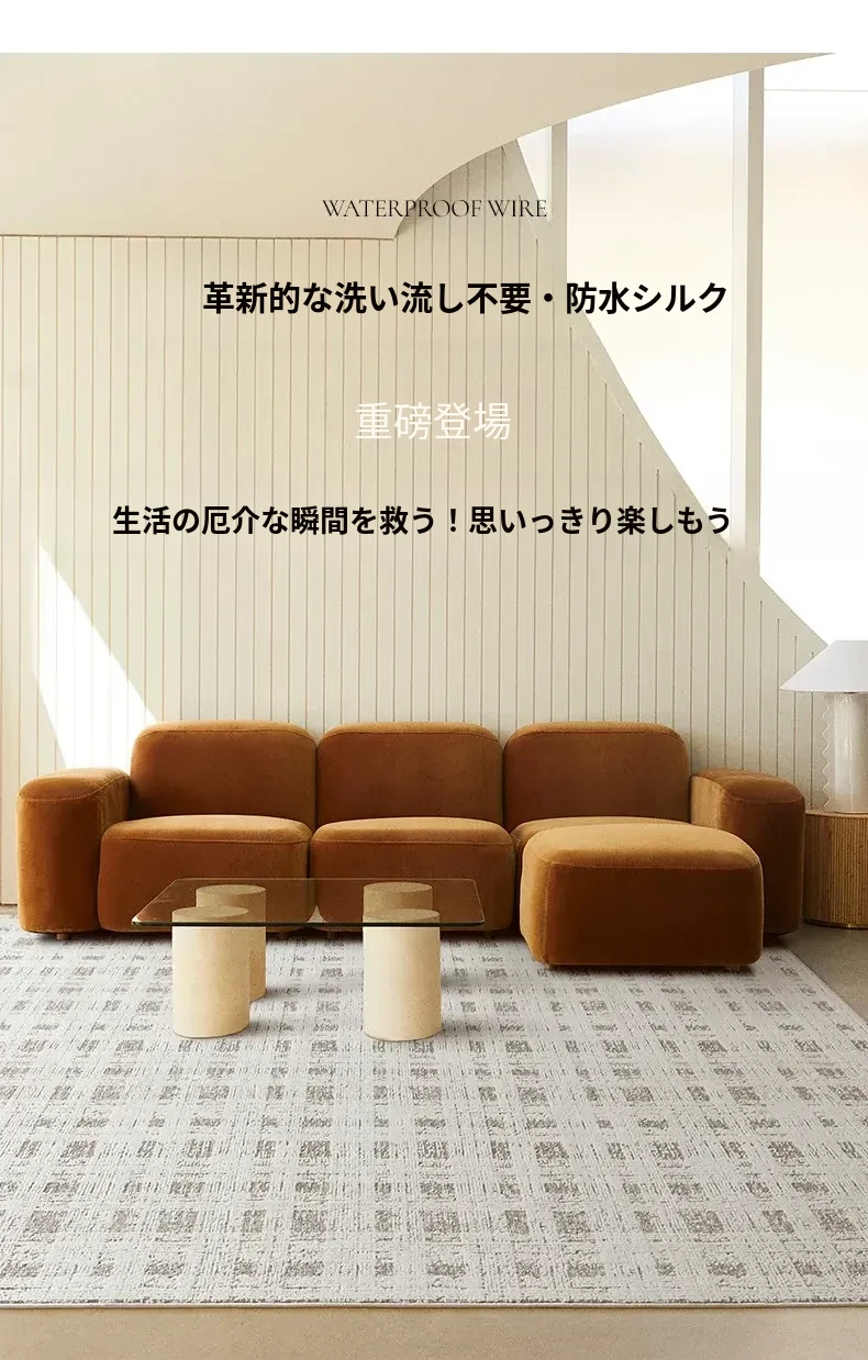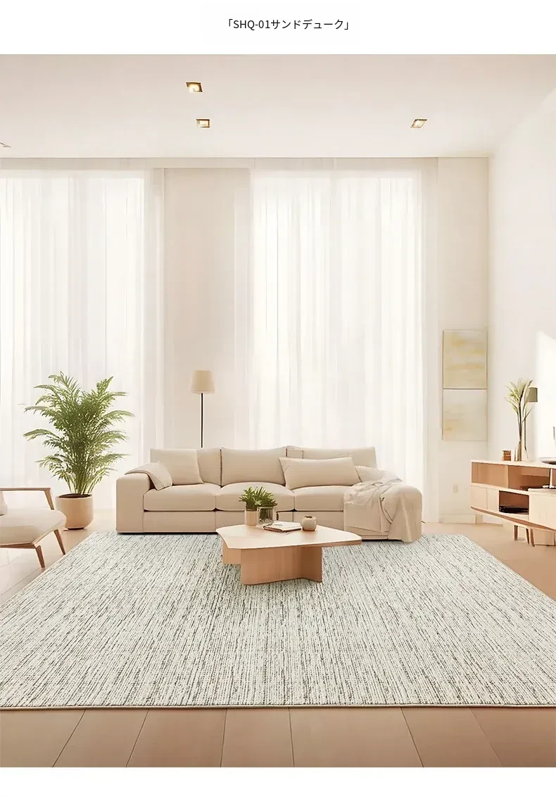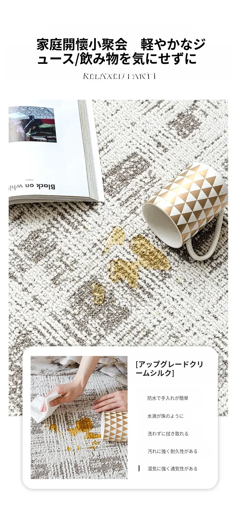 視覚と味覚を楽しむ防水・防汚のリビングラグ!手間いらずでお手入れ簡単、クリーミーな風合いで軽やかさと高級感を演出。侘寂の美しさを引き立てる、あなたの空間にぴったりのアイテムです。