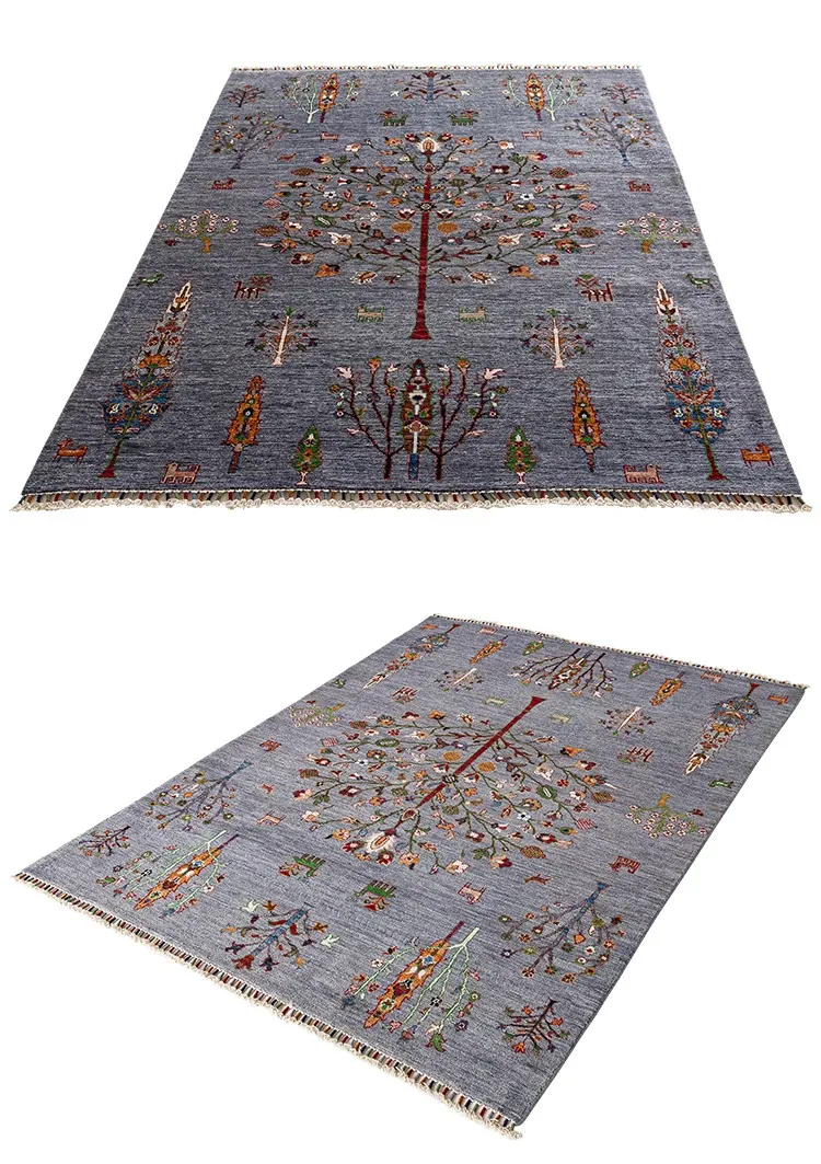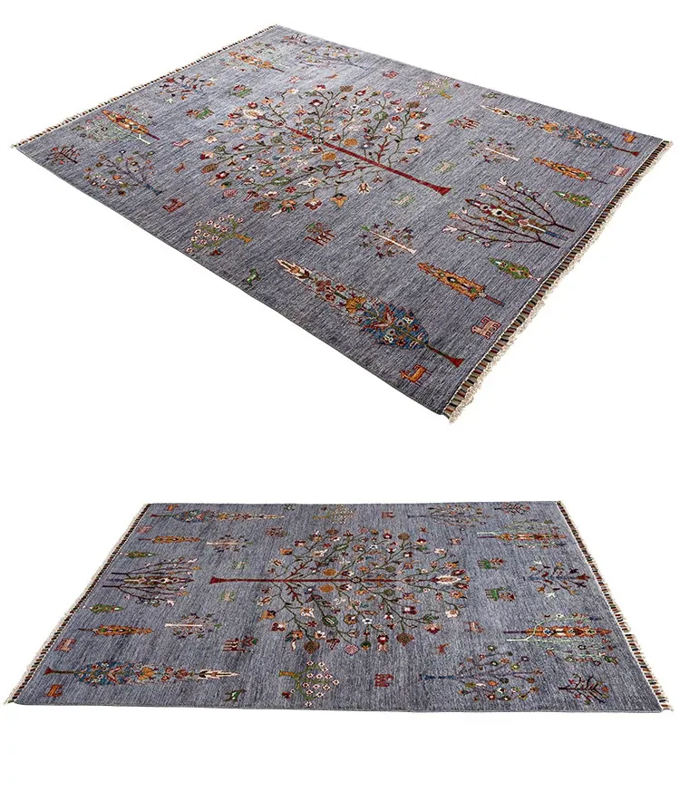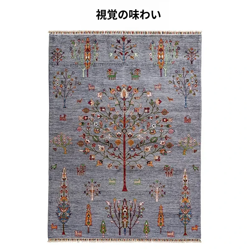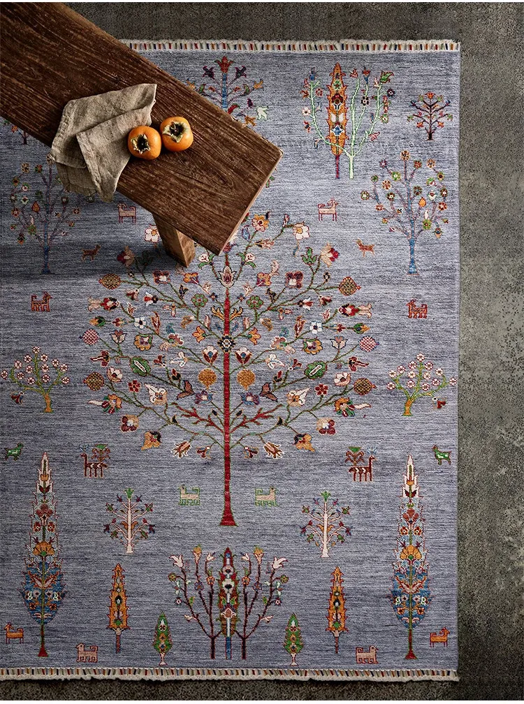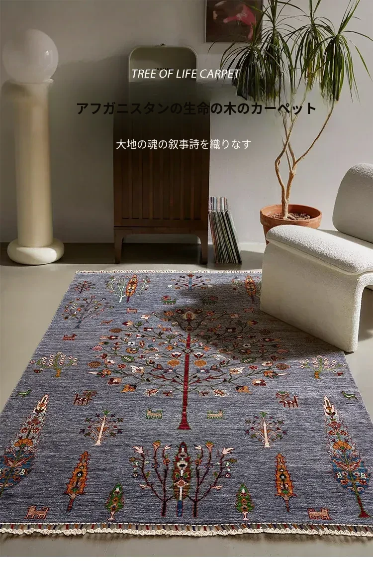 視覚的な美味しさ!アフガニスタン直輸入の手作りウールラグ、リビングにぴったりのコレクターズアイテム、神秘的な霧の青色の生命の樹ラグ。