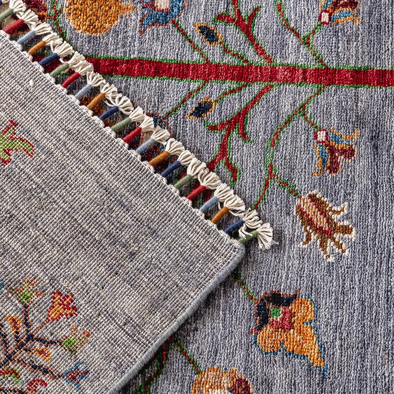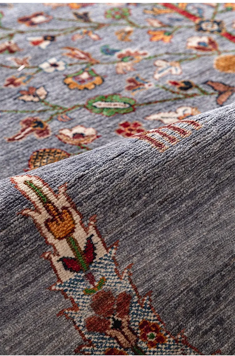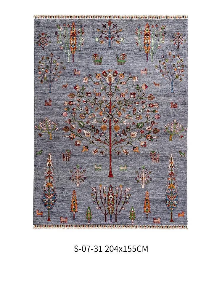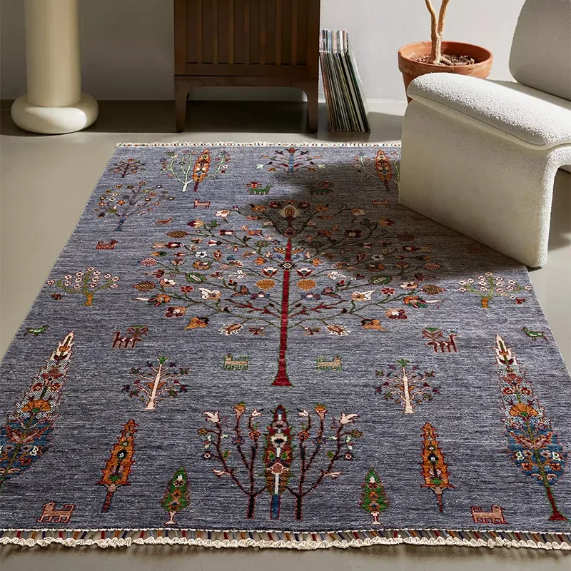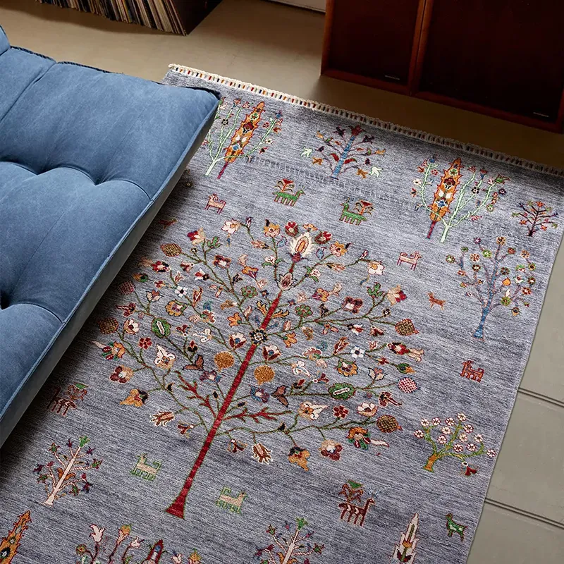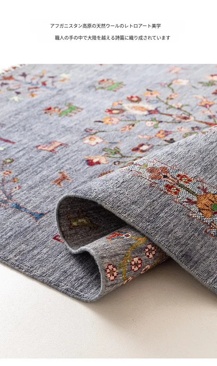 視覚的な美味しさ!アフガニスタン直輸入の手作りウールラグ、リビングにぴったりのコレクターズアイテム、神秘的な霧の青色の生命の樹ラグ。