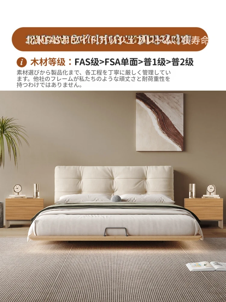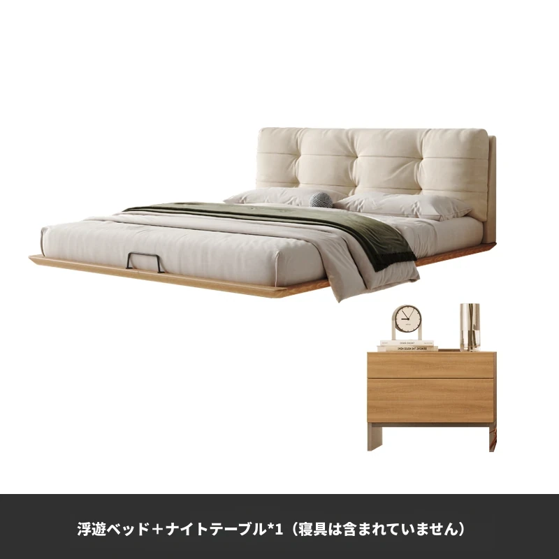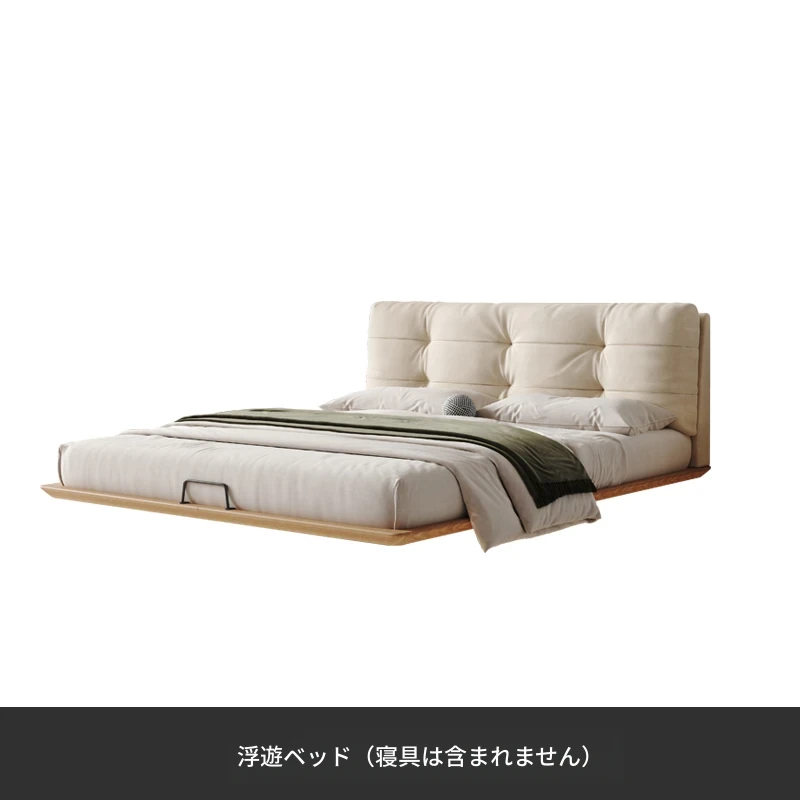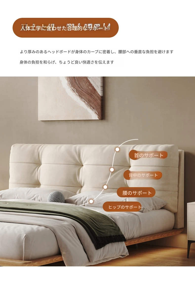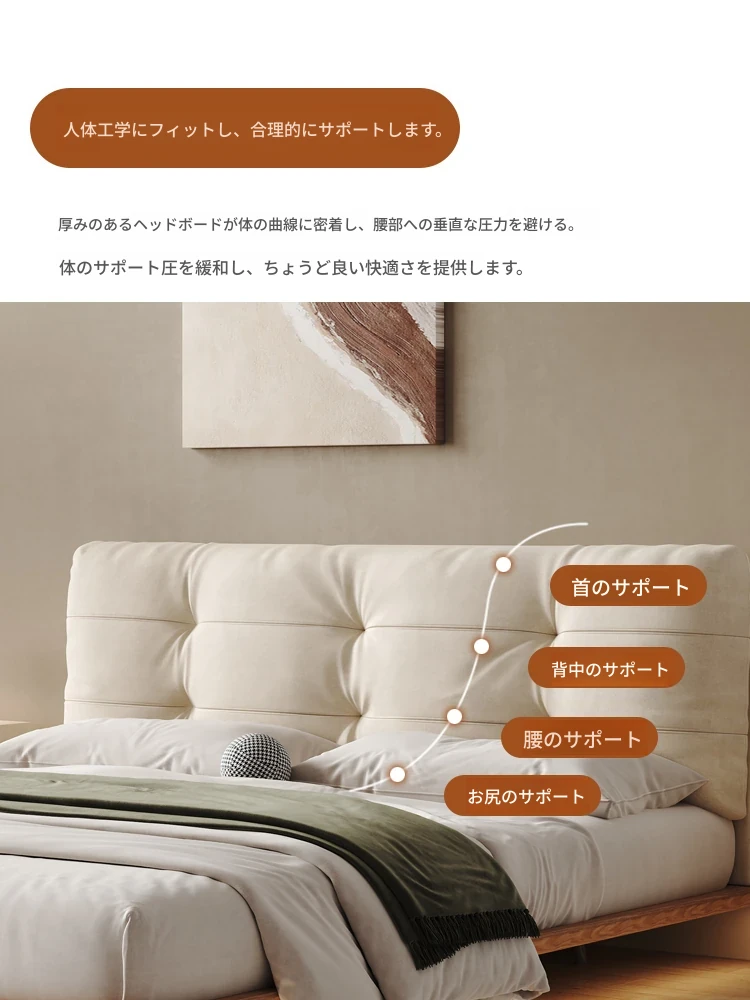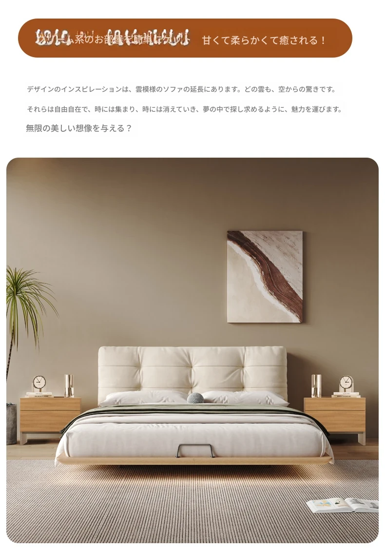 日本の美学を感じる!天然木製侘び寂びデザインの雲形フローティングベッド (1.8m/1.5m)、心地よいファブリック、背もたれ付きで極上の寝心地を提供する一流の主寝室用ダブルベッド!