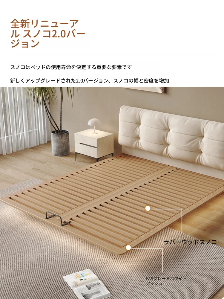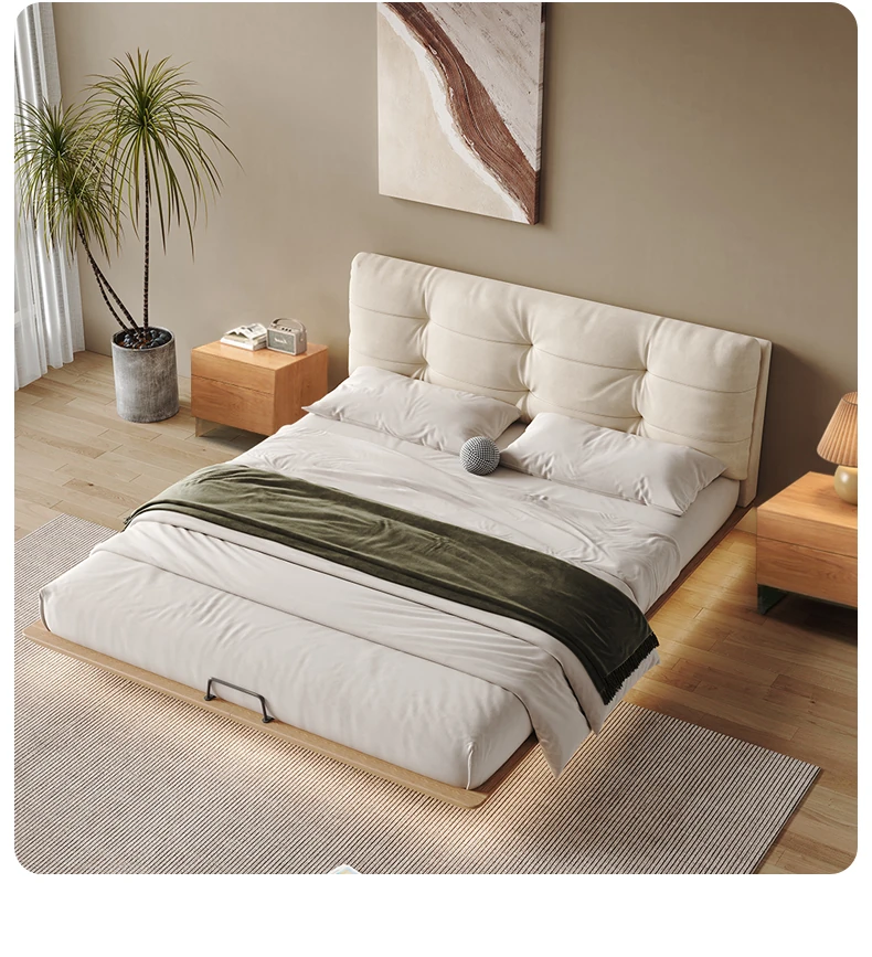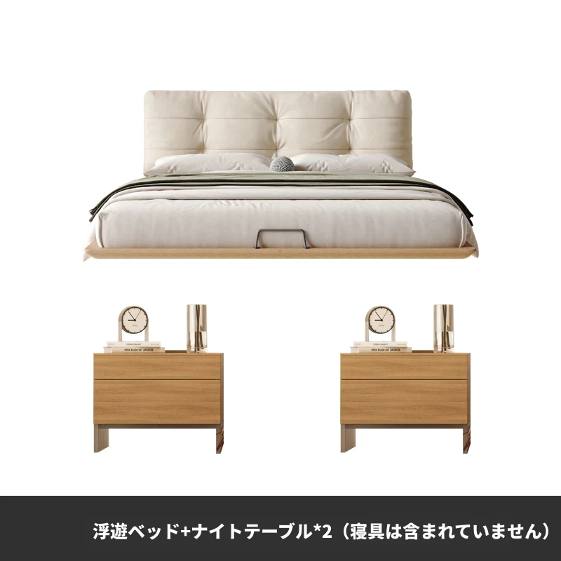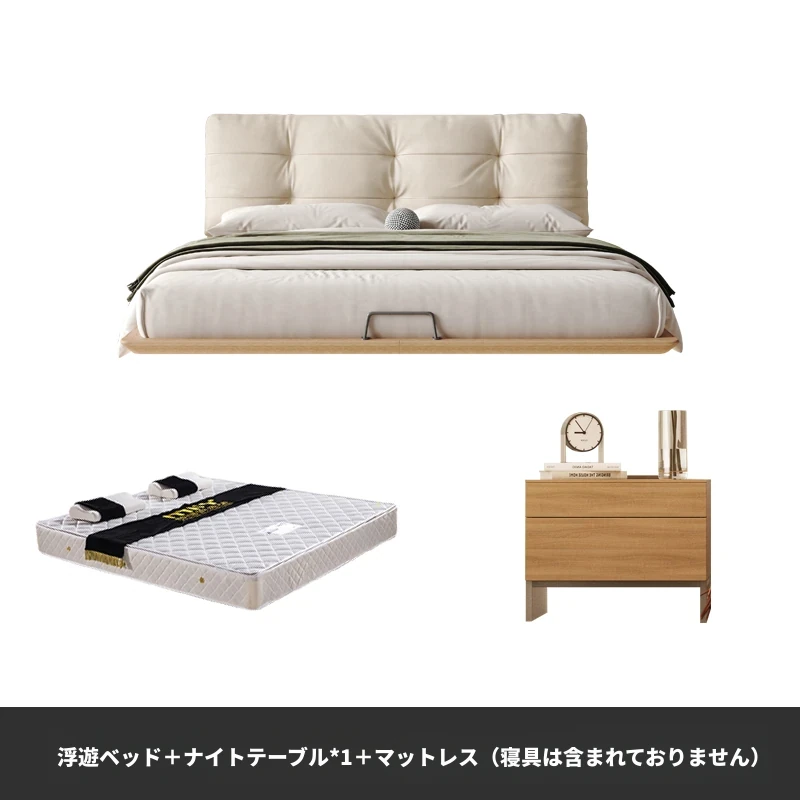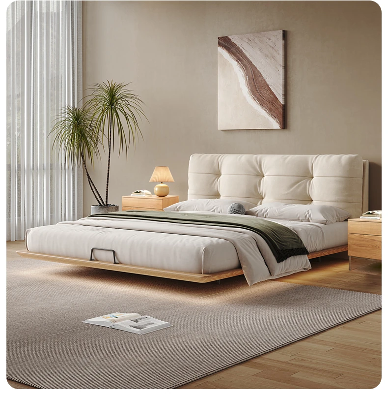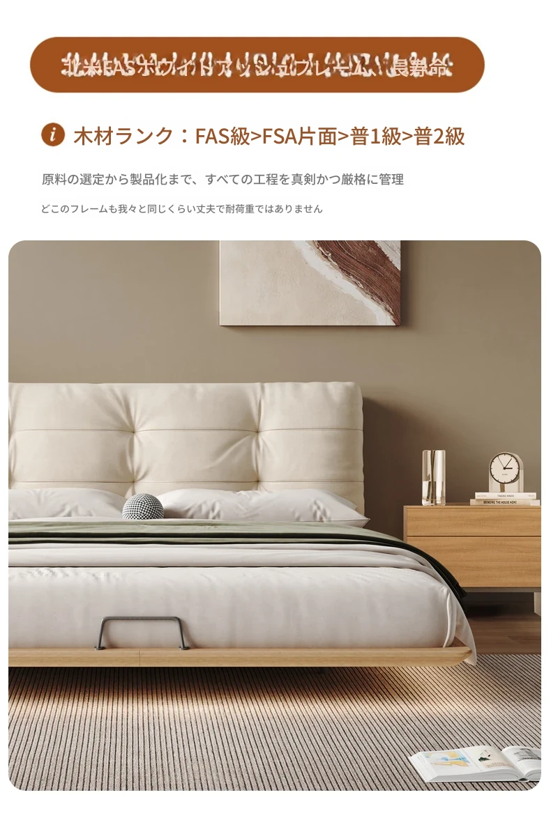 日本の美学を感じる!天然木製侘び寂びデザインの雲形フローティングベッド (1.8m/1.5m)、心地よいファブリック、背もたれ付きで極上の寝心地を提供する一流の主寝室用ダブルベッド!