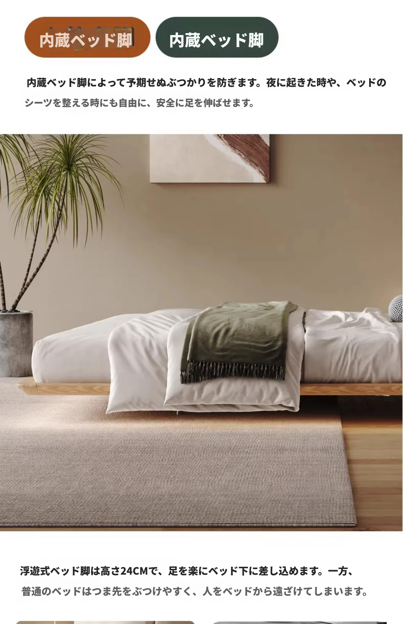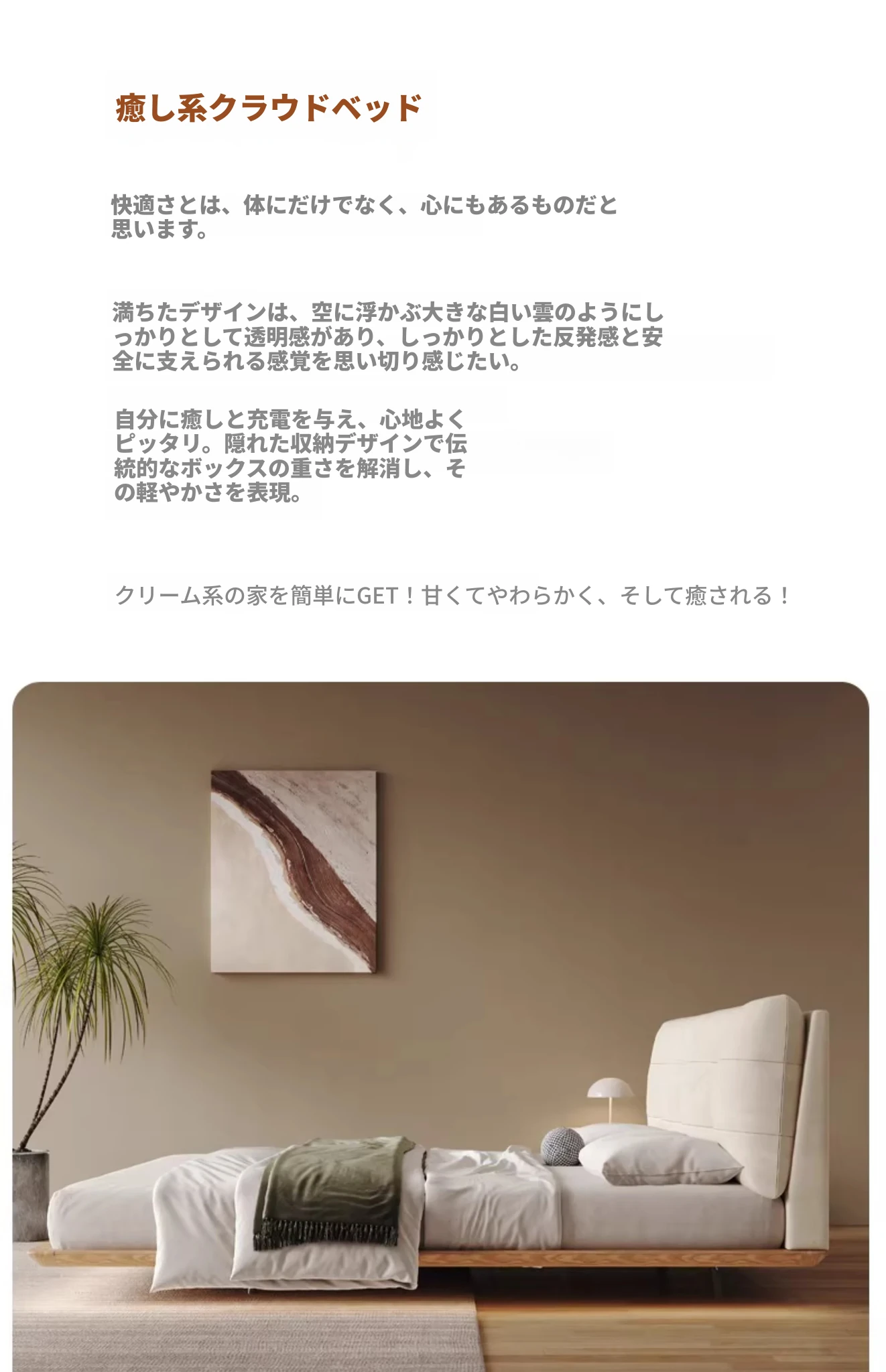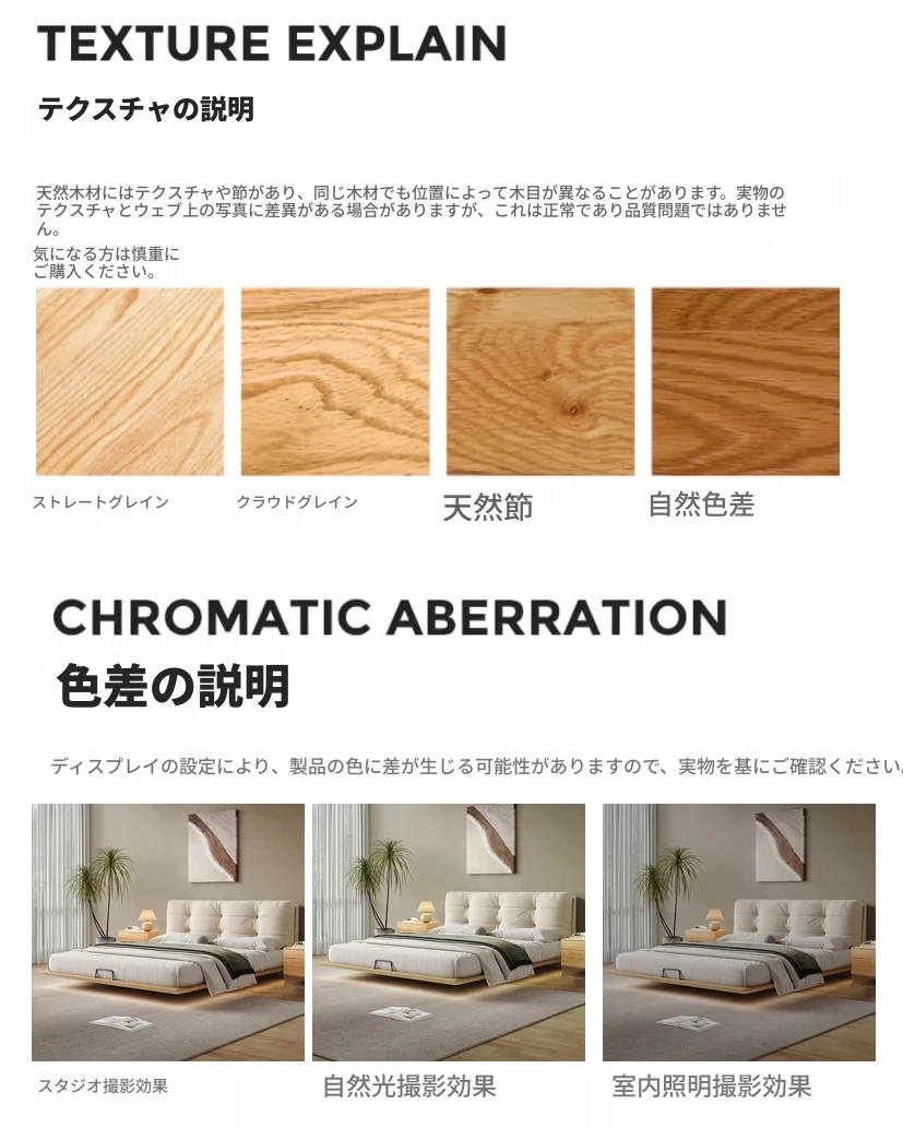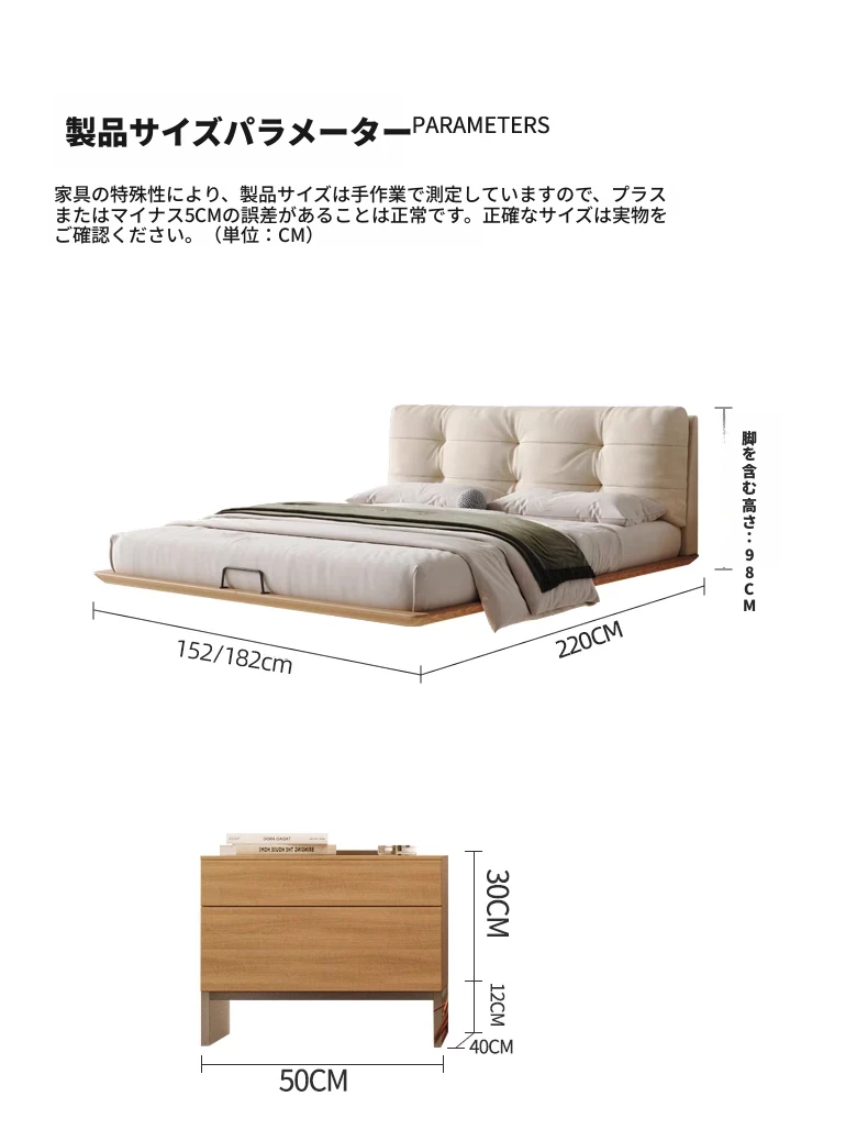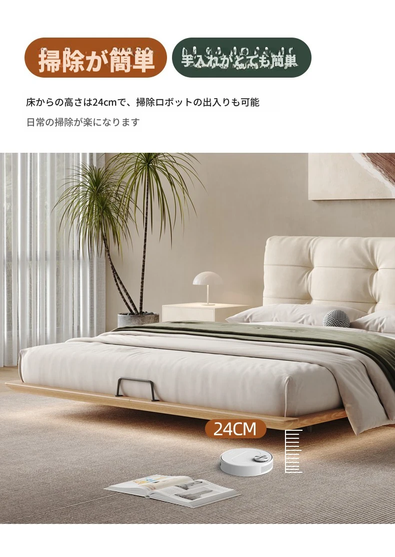 日本の美学を感じる!天然木製侘び寂びデザインの雲形フローティングベッド (1.8m/1.5m)、心地よいファブリック、背もたれ付きで極上の寝心地を提供する一流の主寝室用ダブルベッド!