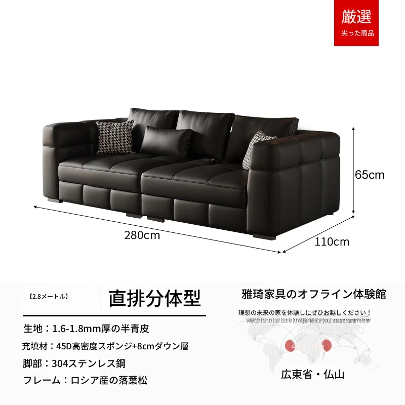 【2.8メートル/分割】 【快適ダウンレイヤー+高密度リバウンドスポンジ+全無垢木フレーム】 【トップグレイン本革、偽りには十倍の罰】