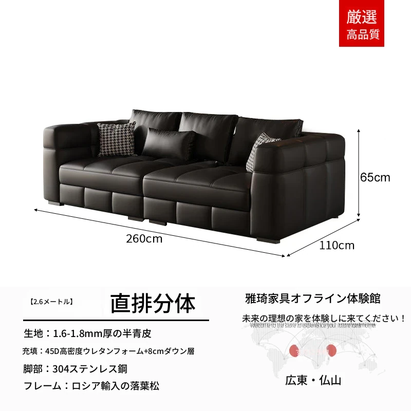 【2.6メートル/分割】 【快適ダウンレイヤー+高密度リバウンドスポンジ+全無垢木フレーム】 【トップグレイン本革、偽りには十倍の罰】