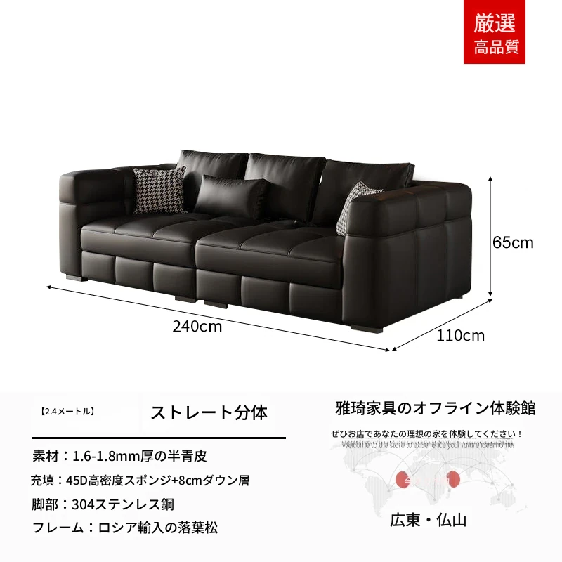 【2.4メートル/分割】 【快適ダウンレイヤー+高密度リバウンドスポンジ+全無垢木フレーム】 【トップグレイン本革、偽りには十倍の罰】