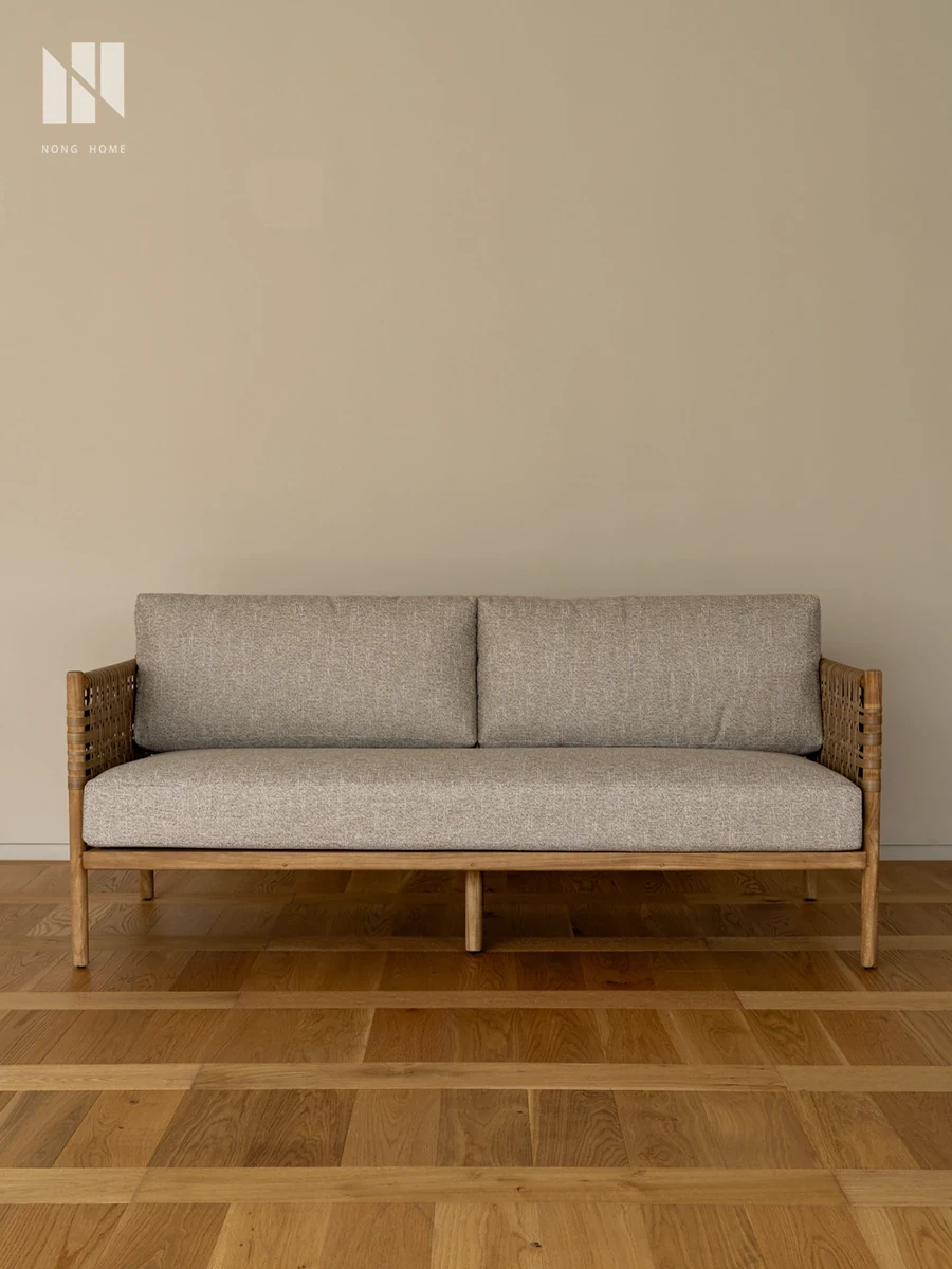 南洋ビンテージ風リビング用無垢材ソファ|和モダンな侘寂スタイルの籐編み3人掛けソファ|民宿やカフェにぴったりのスタイリッシュなカウンターソファ!